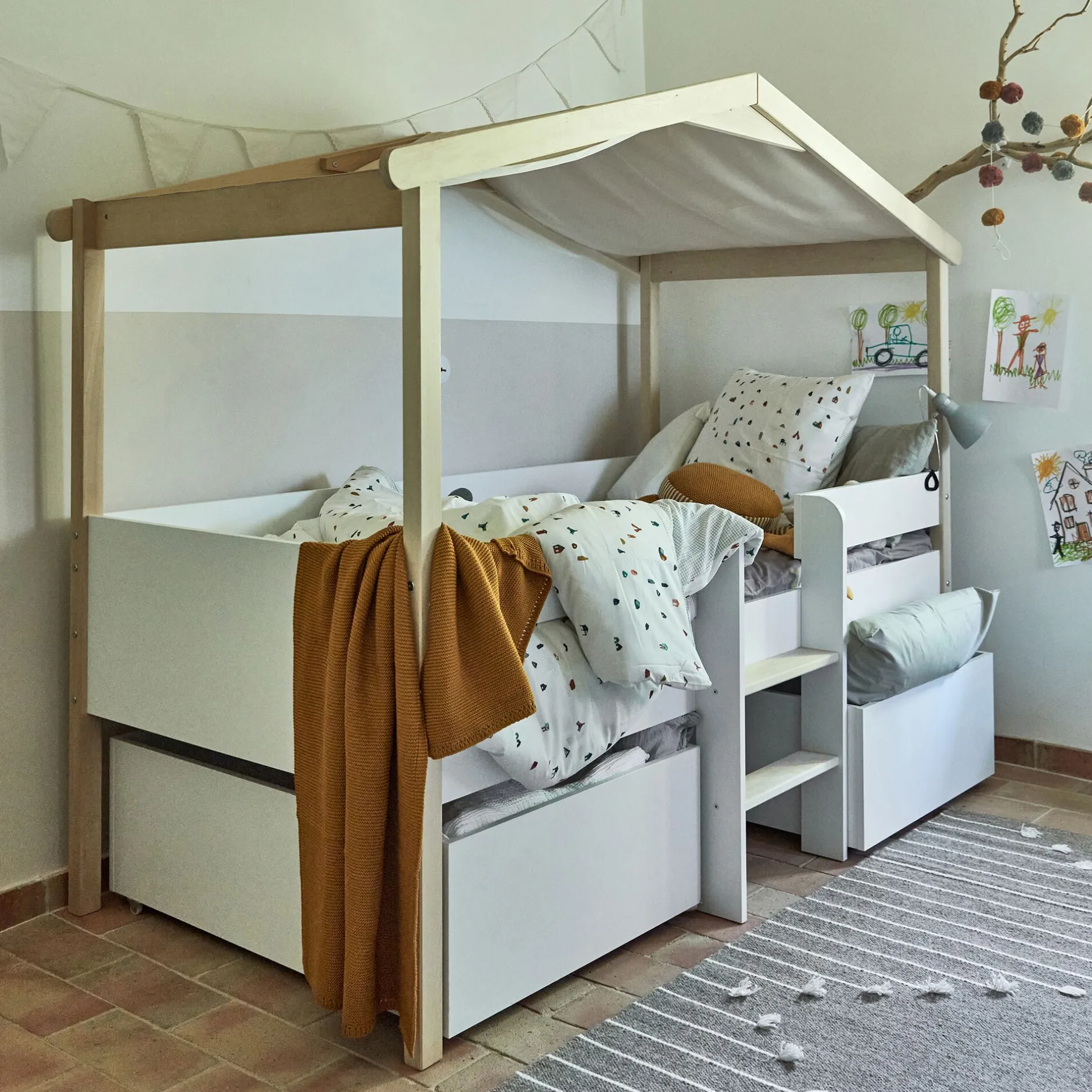 Le lit enfant Piloti a tout pour plaire. Inspiré d’une maison sur pilotis, ce lit en hauteur présente un toit en tilleul. Véritable petite cabane, ce lit sur pilotis stimule l’imagination et la créativité de votre enfant. Terrain d’aventure, de très belles histoires naîtront sous ce toit en bois. Légèrement surélevé, ce lit cabane blanc est vendu avec deux tiroirs de rangement coulissants. Ces derniers sont dissimulés sous le lit et laissent les vêtements, accessoires et jouets de votre tout petit à portée de main. Ainsi, ce dernier est plus autonome et la chambre enfant reste toujours bien rangée, avec un espace au sol optimisé. Ce lit cabane en bois mesure 90×200 cm, une taille idéale pour les enfants de 5 à 10 ans.