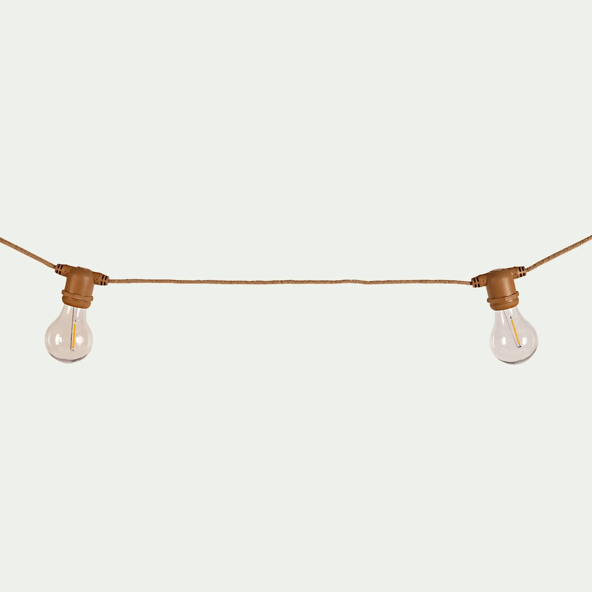 Une guirlande d’extérieur pour illuminer votre jardin. Elle est composée de 10 LED qui diffusent une lumière chaleureuse et conviviale. Un câble en jute qui apporte une touche naturelle et authentique à votre décoration de jardin. Placez la guirlande en hauteur, sur un mur ou au milieu de vos plantes pour les mettre en valeur.