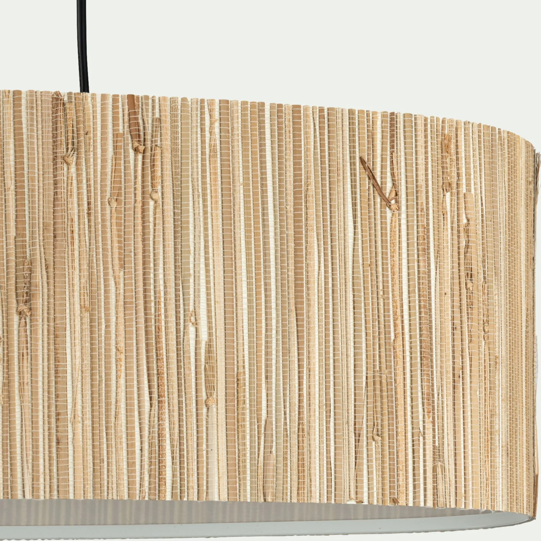 Cette majestueuse suspension électrifiée habille vos hauteurs sous plafond avec charme et élégance. Circulaire, cette suspension naturelle dissimule en son sein deux lampes. Leur fusion donne vie à une suspension XXL qui s’impose comme la pièce maîtresse du séjour. Ce luminaire présente une structure en acier noir, délicatement soulignée par un abat-jour en algues. Les fibres naturelles sont tissées entre elles pour créer ce camaïeu de nuances dorées qui viennent illuminer la pièce. Originale, cette grande suspension en algues participe à une atmosphère accueillante et conviviale.