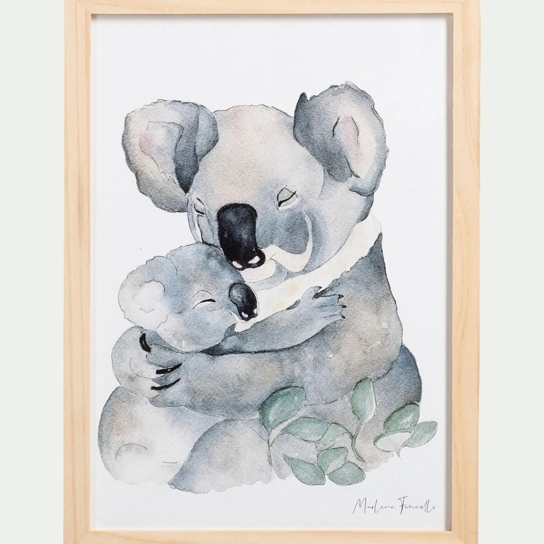 Cette affiche au design animal conçue avec la délicate technique de l’aquarelle constitue une magnifique décoration murale pour la chambre de votre bambin. Ce dessin, confectionné par l’artiste française Marlène Fancelli, est encadré dans un délicat cadre en bois de pin et protégé par une vitre de plexiglas. Avec ces deux koalas, ce cadre au format A4 s’associe avec des tonalités chaudes comme des coloris pastel. Placez ce cadre à côté d’autres de la même collection et quelques miroirs afin de composer une décoration raffinée et cocooning qui saura apaiser votre enfant. Grâce à la présence d’accroches au dos du cadre, vous pourrez le placer en toute simplicité.