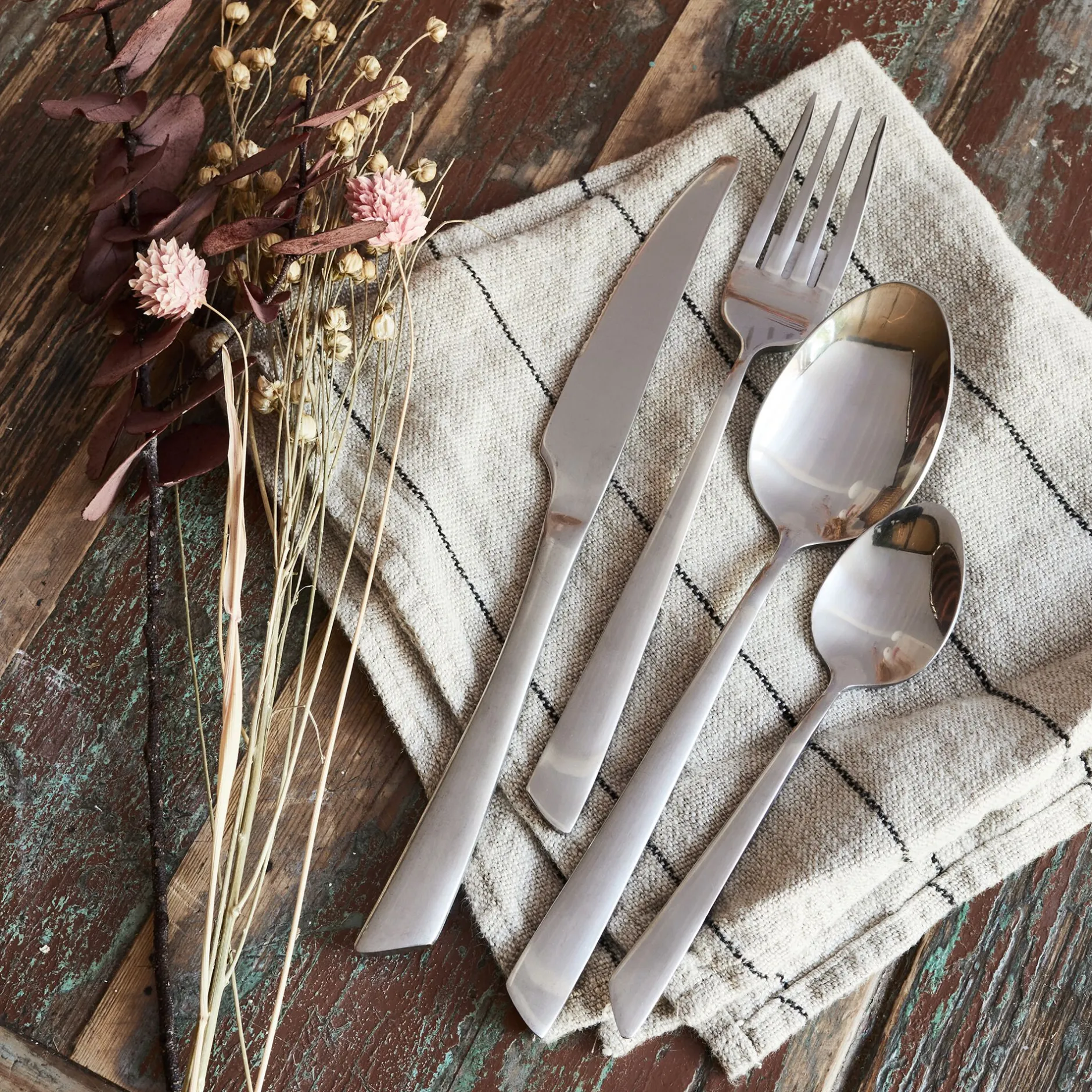 De jolis assortiments de couverts se composant de fourchettes, couteaux, cuillères et petites cuillères, pour chaque plat de votre repas. Sublimez votre dressage de table avec ces couverts, accompagnés de belles assiettes et de jolis verres, ainsi que de belles serviettes, afin d’obtenir une ambiance chaleureuse et raffinée.