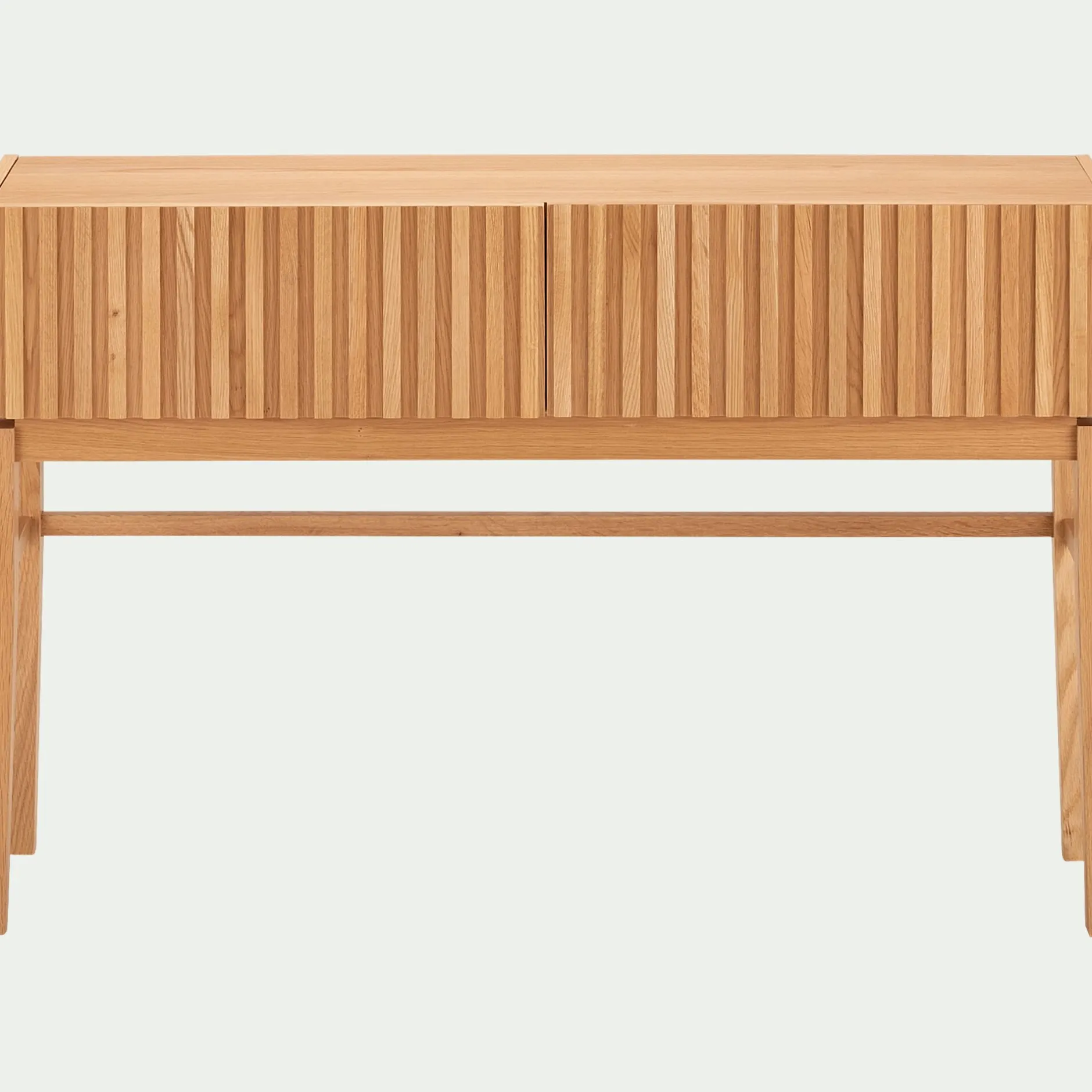 Cette console en bois est un meuble parfait pour magnifier une entrée. De 120 cm de long pour 30 cm de large, elle est suffisament étroite pour compléter la décoration d’un petit espace. Ses pieds longilignes sont surmontés de deux grands tiroirs de rangement ainsi que d’un plateau. Collée contre un mur, cette console naturelle vient souligner votre peinture et apporter de la chaleur à la décoration. A mi-chemin entre le style rustique et graphique, cette console en chêne a tout pour plaire.