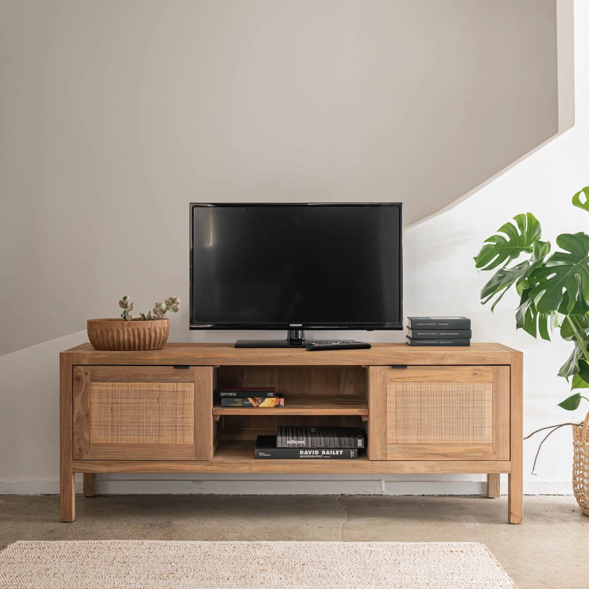 Liez l’utile à l’agréable avec ce meuble tv. Ce meuble de salon saura trouver sa place dans votre pièce de vie et conviendra parfaitement pour accueillir votre télévision. Ce mobilier d’intérieur est conçu en teck recyclé et cannage, alliant design et robustesse. Ce meuble tv en bois apporte une touche naturelle à la déco de votre pièce. Le séjour gagne en authenticité grâce à cette finition en cannage, élégante et authentique. Ce meuble tv en cannage présente deux portes battantes et 4 niches de rangement, parfaites pour un salon toujours bien organisé.