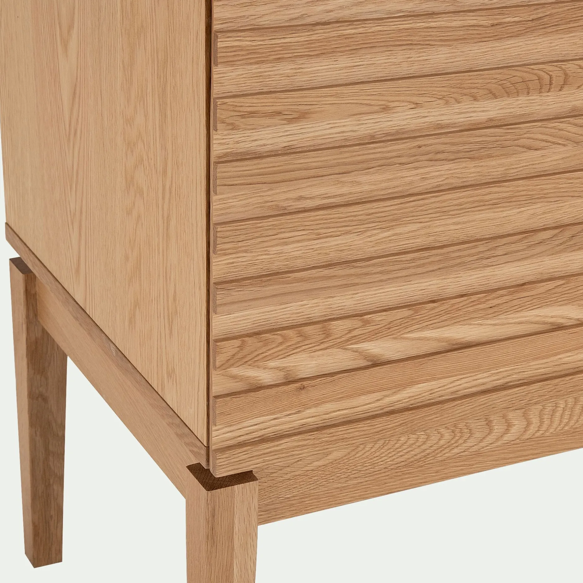 Le meuble TV Feve se joue des code établis. Il arbore un savant mélange entre style urbain et naturel grâce à son placage chêne, pure et authentique, ainsi qu’à son détail structuré plus moderne et travaillé. Equipé de deux passe-câbles, ses niche pourront accueillir vos équipements multimedia en camouflant tous vos fils. Un panneau au relief étudié coulisse facilement pour dissimuler et ranger simplement. Un meuble télé au design épuré qui s’intègrera dans un intérieur où les matières nobles et naturelles ont la part belle.