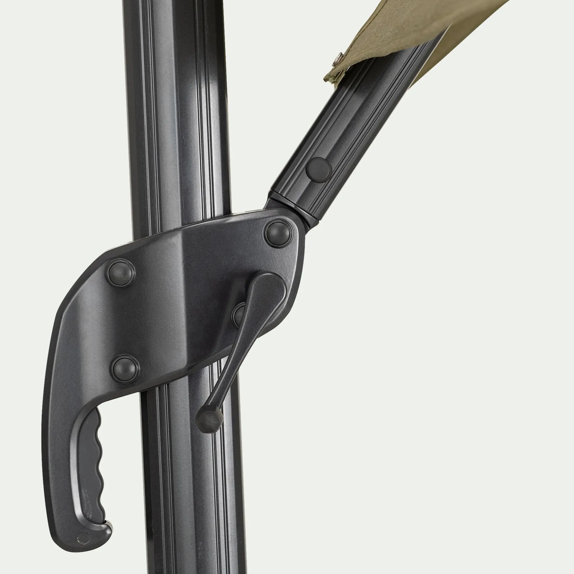 Le parasol déporté Tramontagne crée un coin d’ombre agréable tout au long de la journée. Grâce à son pied déporté, sa rotation à 360° et son réglage sur 5 positions, il s’adapte facilement à l’ensoleillement. Sa toile verte de 300 cm de diamètre se fond dans le décor naturel, tandis que sa structure noire apporte une touche contemporaine. Avec son pied en croix, ce parasol est prêt à l’emploi pour des moments de détente en extérieur.
