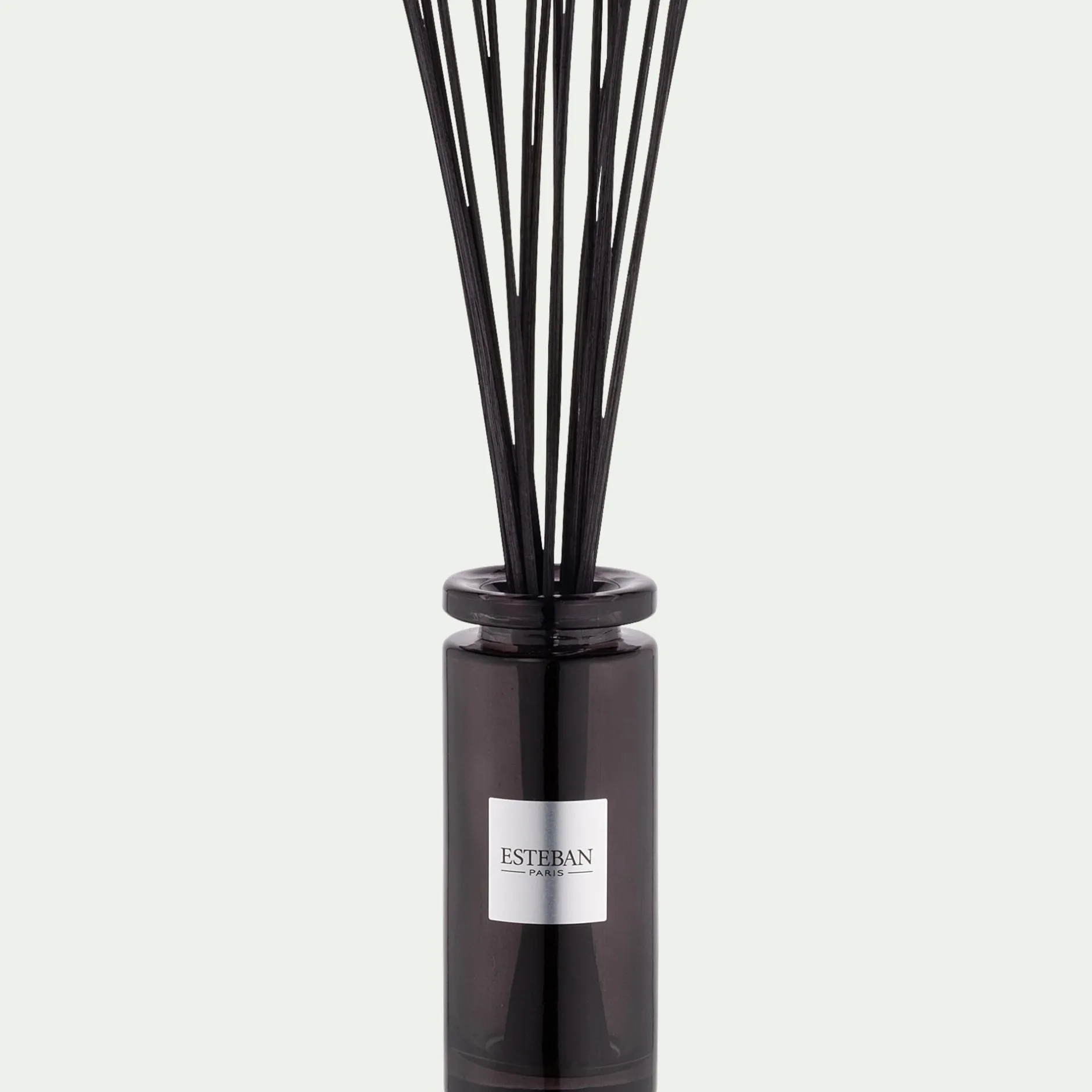Alcool végétal sans phtalate et tiges en rotin. Capot en bois, insert métal et verre laqué.