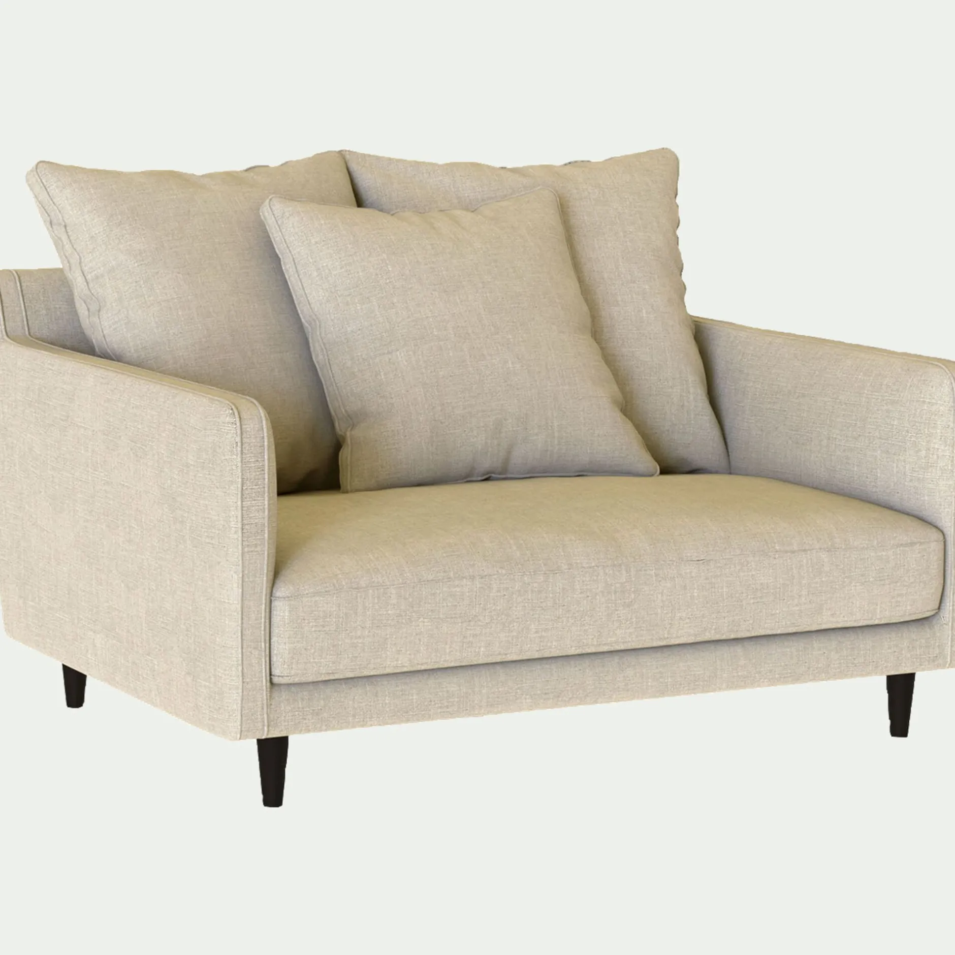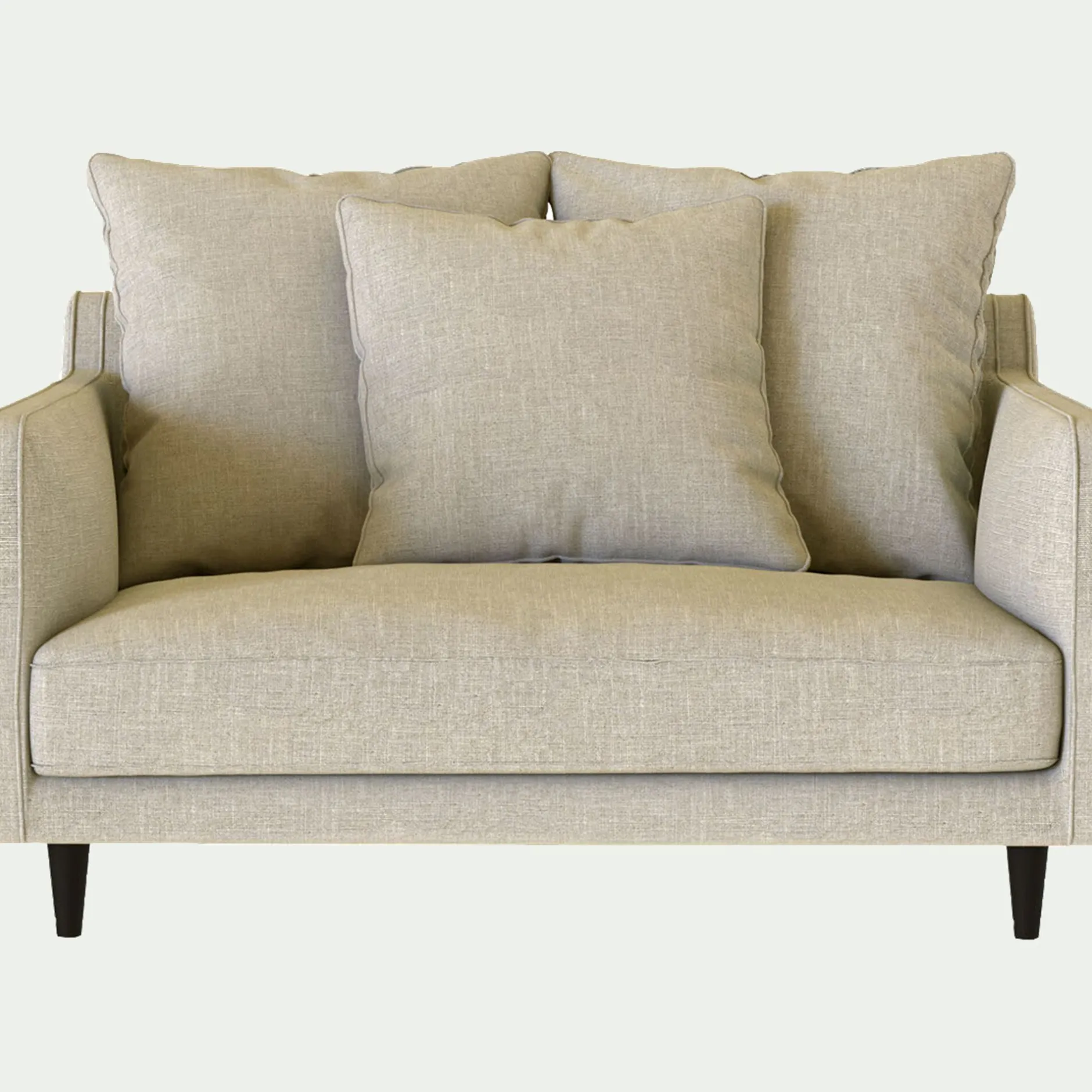 Assise et dossier : Assise en mousse polyuréthane densité 30kg/m3 et couette en fibre polyester. Coussins dossier garnissage plumes d’oies et fibres polyester. 2 coussins de 60x60cm et 1 coussin de 50x50cm.