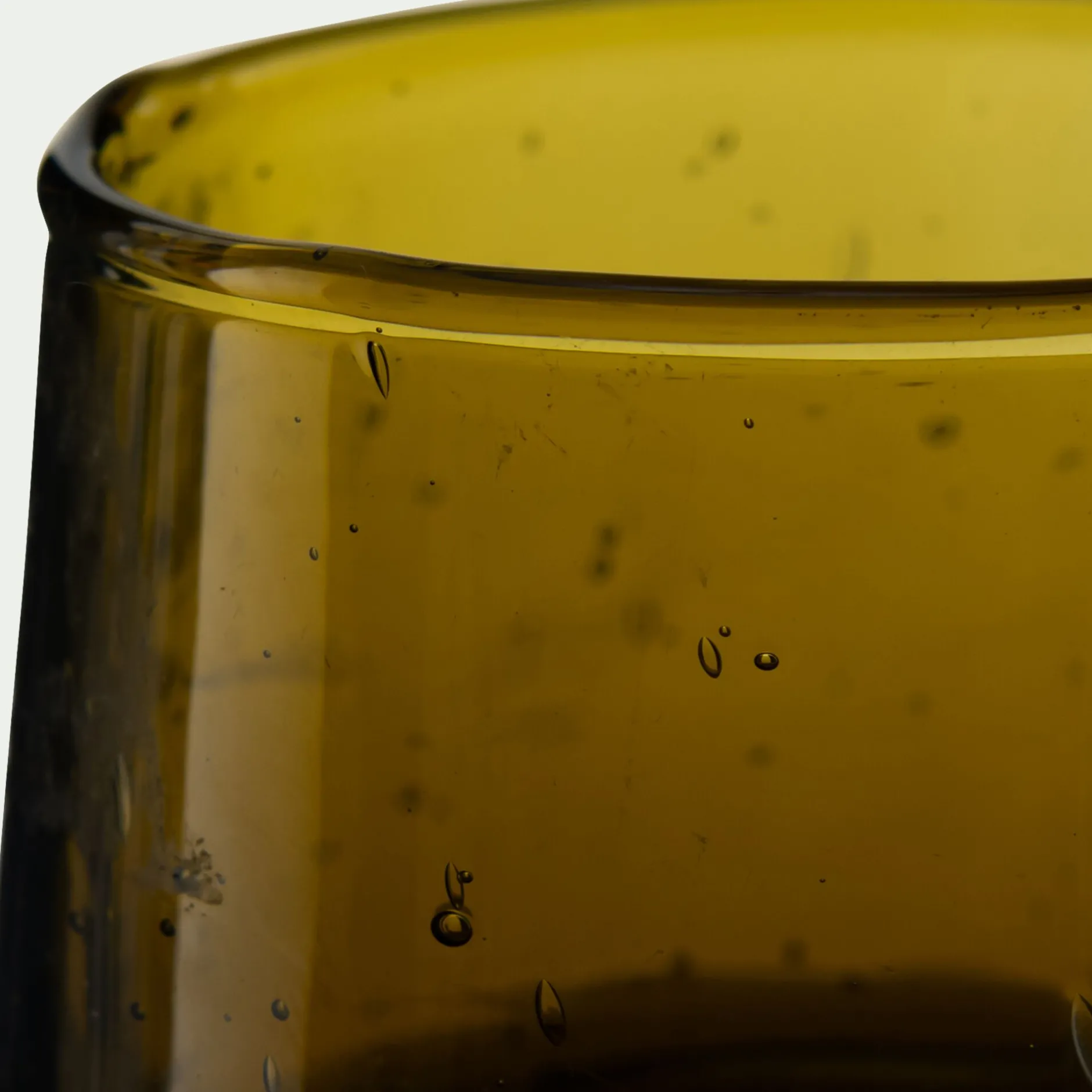 Petit et plein de charme, ce photophore en verre bullé de couleur vert mousse séduit par son jeu de transparence. De petites bulles emprisonnées dans la matière lui donnent une allure poétique, presque vivante. Fabriqué au Maroc, il accueille une bougie et diffuse une lumière douce et végétale, parfaite pour une ambiance intimiste à la nuit tombée.