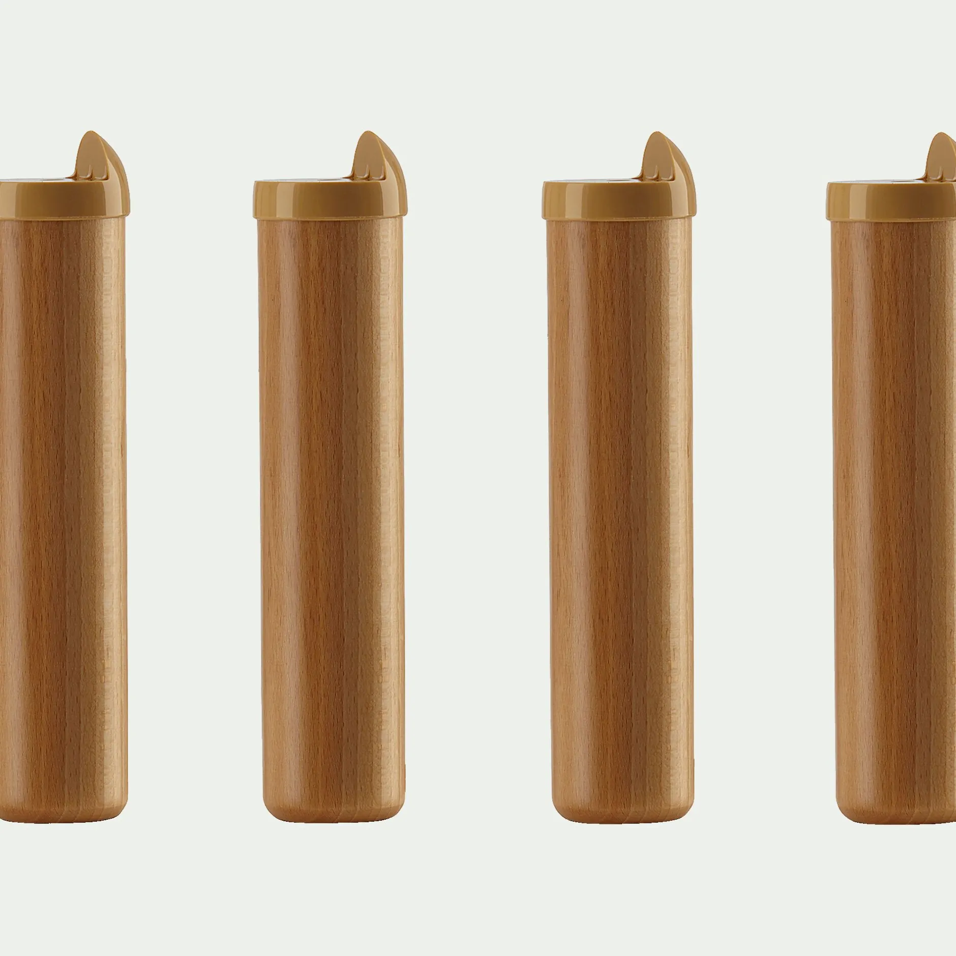 Un jeu de 4 pieds de lit cylindriques en hêtre massif et qui s’adaptent sur tous les sommiers à cadre métallique.
