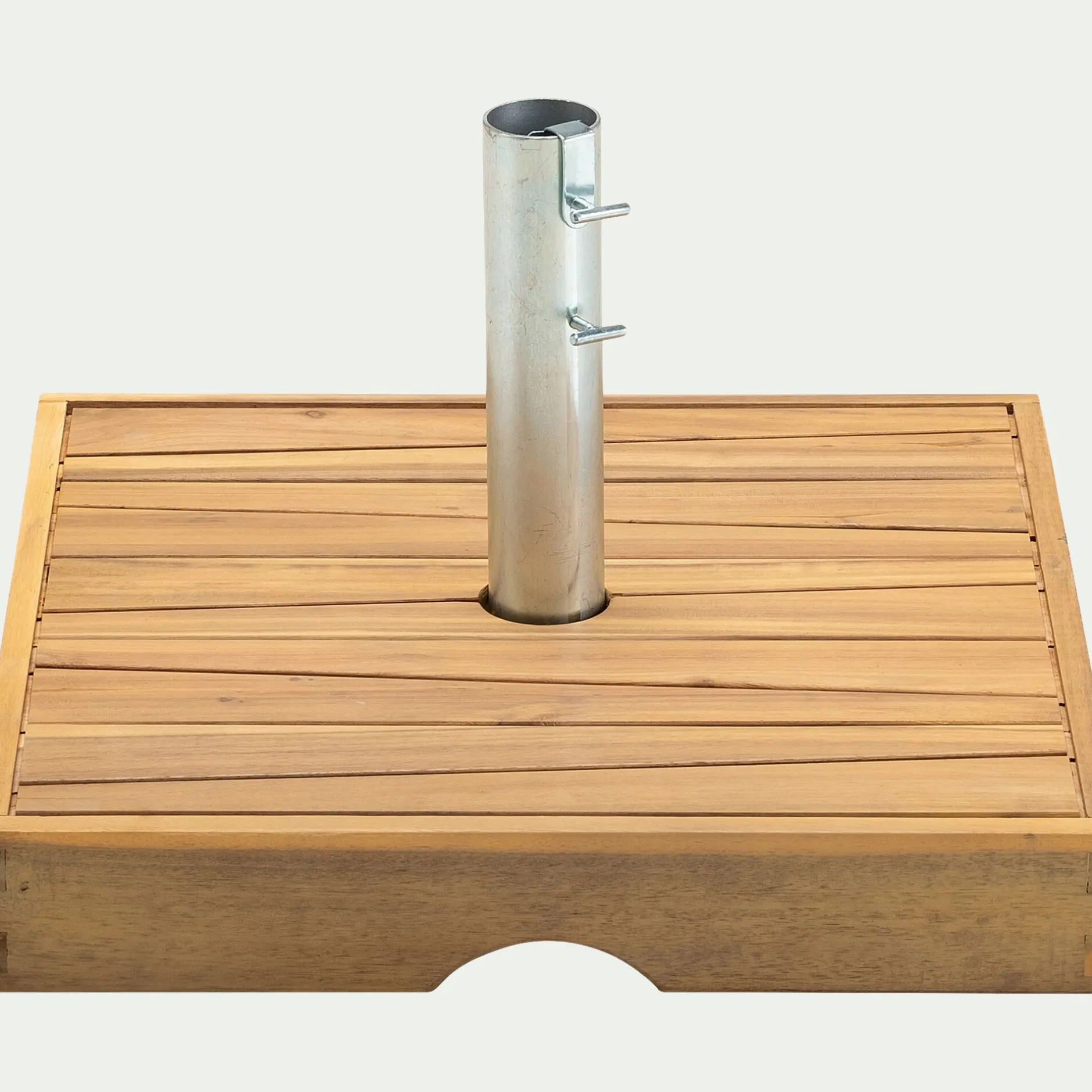 Ce pied de parasol au design chic et épuré est l’accessoire indispensable qui vient compléter votre parasol. Il présente un style intemporel et une association de matières qui saura s’accorder avec tous types de sols et de déco extérieure. Sa base carrée en bois d’acacia permet d’offrir une stabilité parfaite à votre parasol et de profiter des beaux jours, en plein air, et en toute sécurité. Ce pied de parasol est un essentiel des accessoires de jardin.