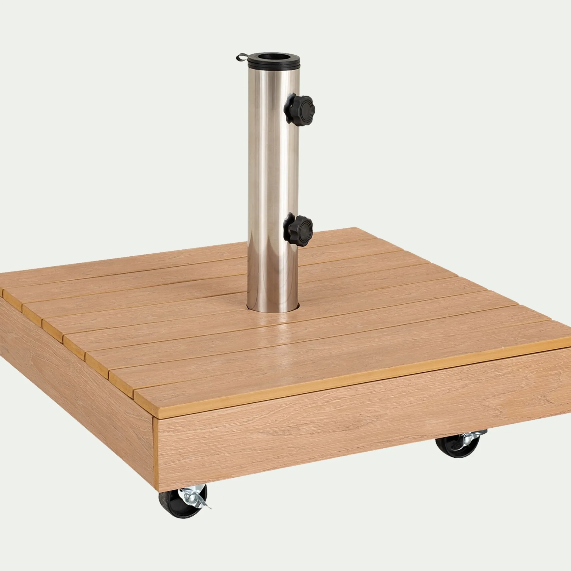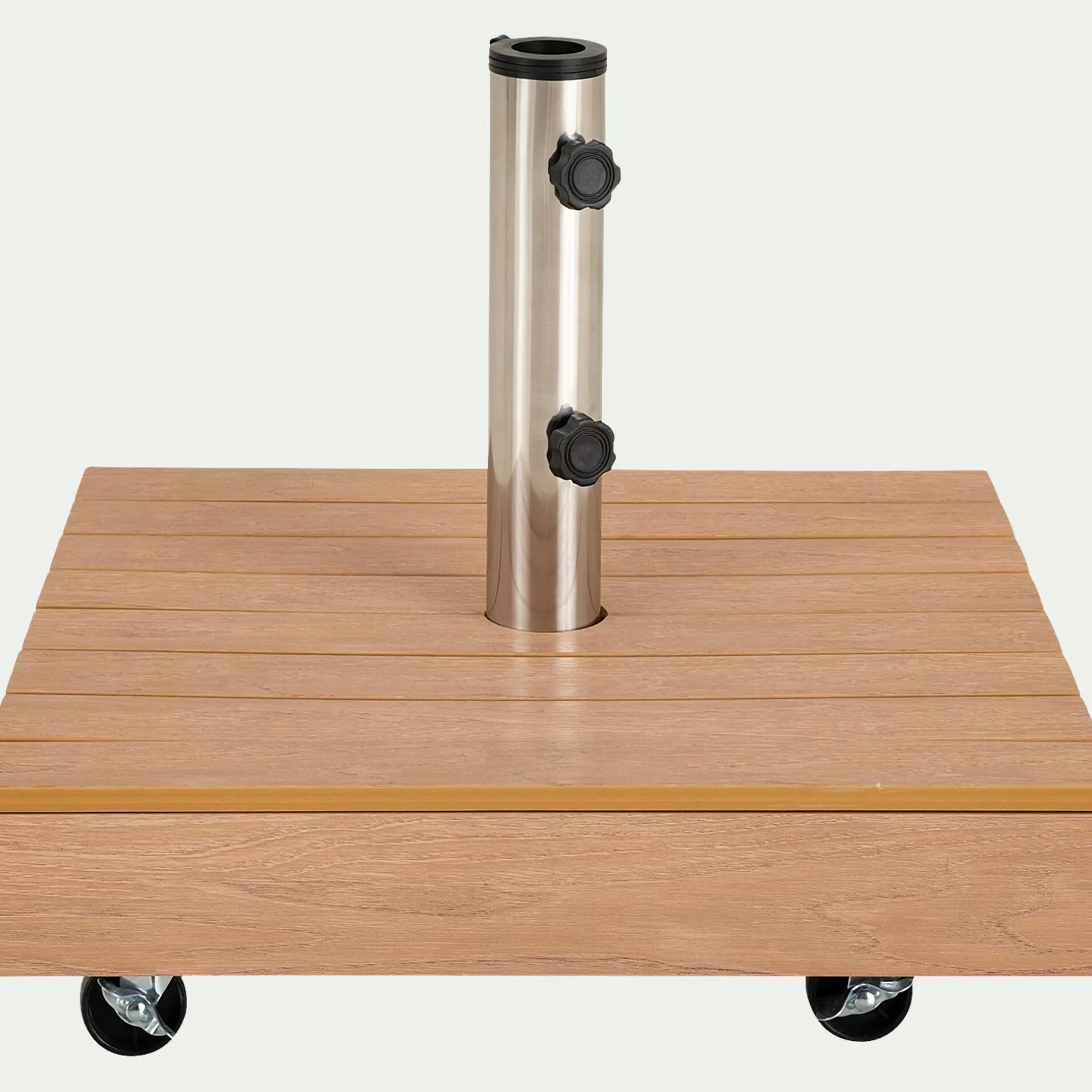 Avec ses 36 kg de béton, ce pied de parasol assure un ancrage solide pour profiter de l’ombre en toute sérénité. Son coffrage en lattes de bois ajoute une touche chaleureuse et authentique à l’espace extérieur. Facile à déplacer grâce à ses 4 roulettes, il permet d’ajuster l’ombre au fil de la journée. Deux vis de serrage viennent compléter l’ensemble pour maintenir fermement le mât du parasol en place.