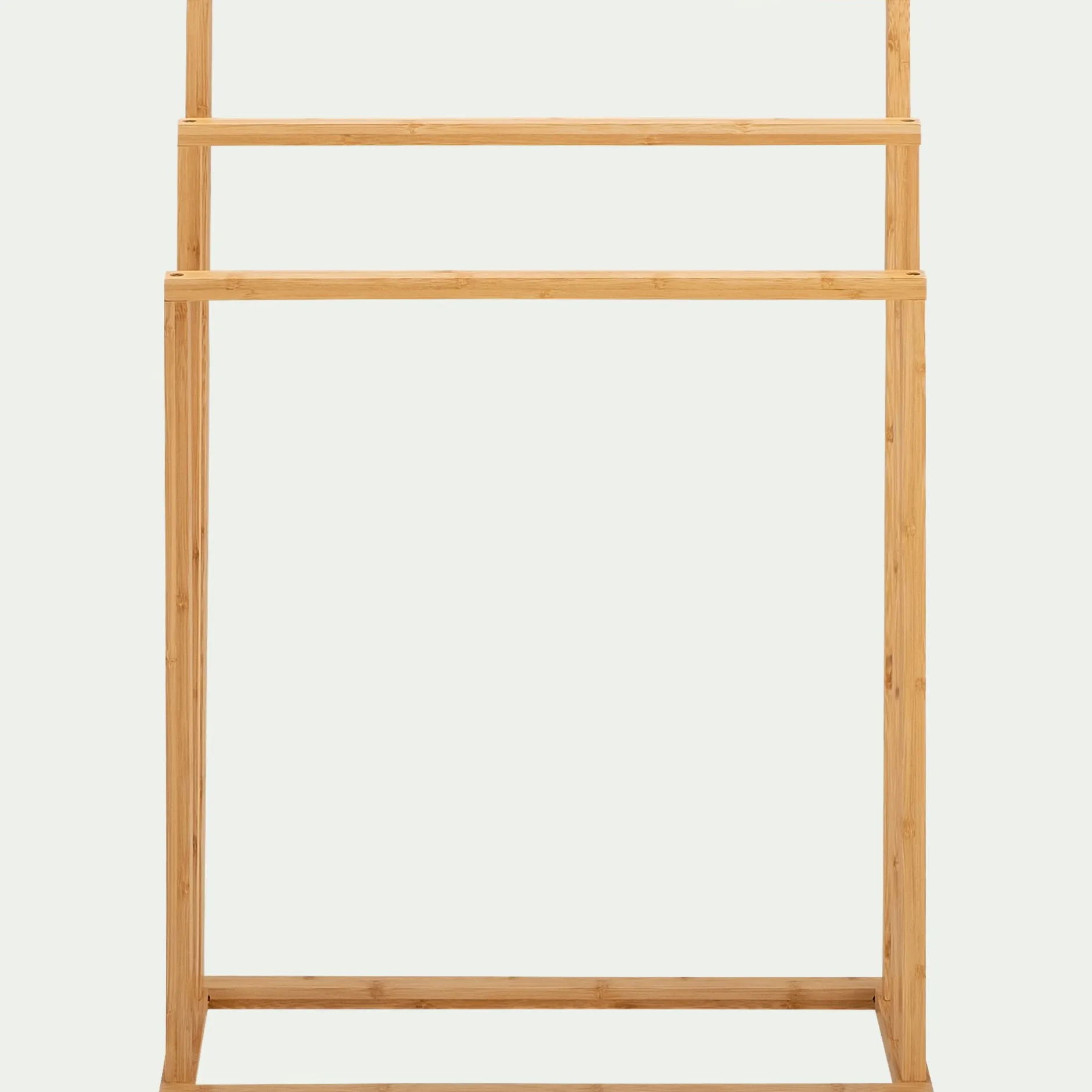 Ce joli porte-serviette s’intègre dans votre salle de bain en toute discrétion. Confectionné en bambou, ce porte-serviette affiche un style à la fois naturel et contemporain qui vous permettra de donner des allures exotiques à votre décoration. Ses lignes droites et épurées donnent vie à un objet élégant, sur lequel faire sécher jusqu’à 3 serviettes simultanément. Simple et raffiné, ce porte-serviette triple se pose directement au sol.