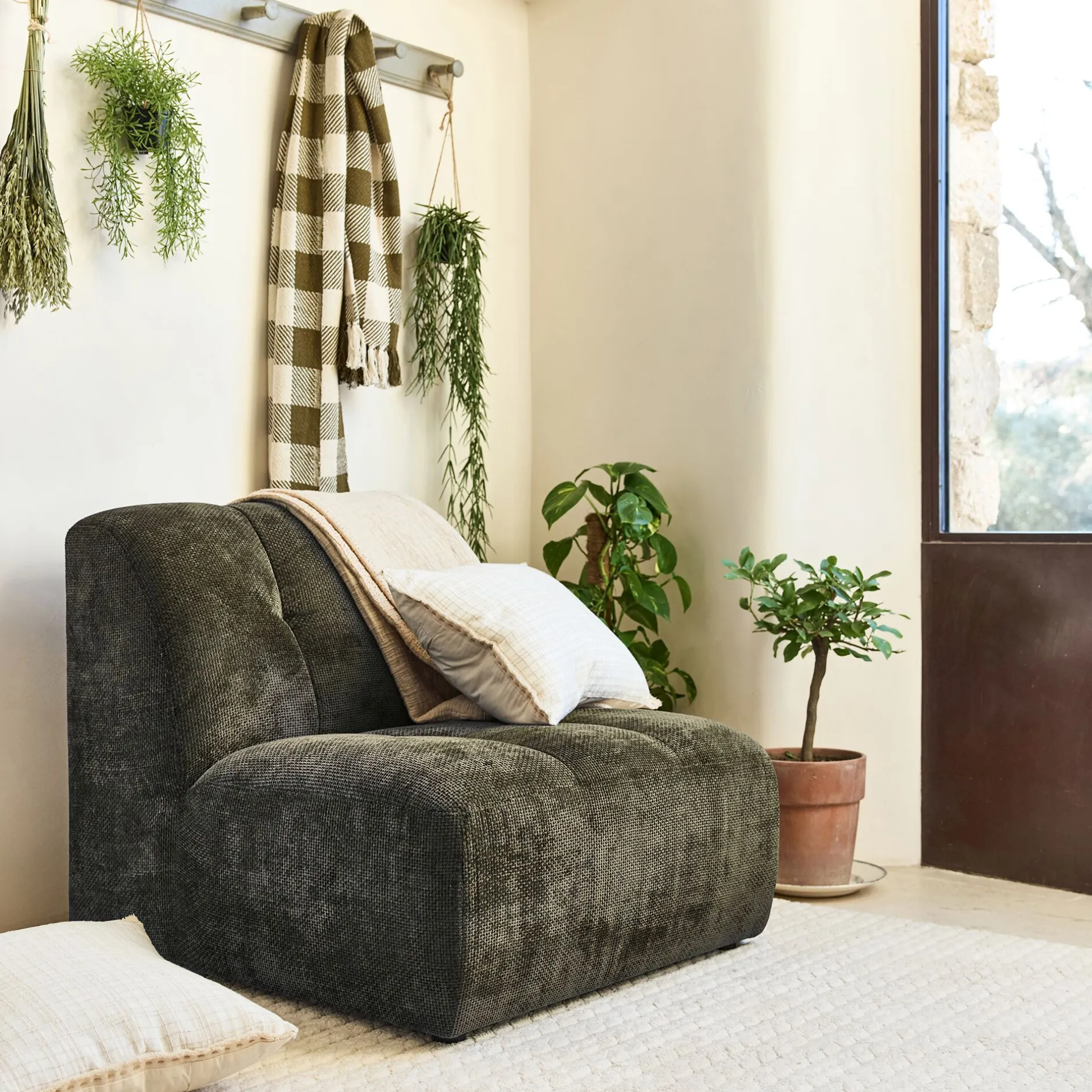 Avec son tissu chunky au maillage généreux, cette petite chauffeuse invite à la détente. Son assise profonde et son dossier moelleux créent un véritable cocon de confort. Son tissu doux et texturé lui donne une forme riche, tandis que des capitons apportent du volume et une touche d’élégance. Utilisée seule comme fauteuil d’appoint ou achetée à plusieurs pour créer un ensemble harmonieux, elle permet de composer un canapé modulable selon les envies. Son coloris vert cèdre, chaleureux et raffiné, s’intègre naturellement dans tous les intérieurs et se marie avec plusieurs gammes de mobilier. Conçue pour durer, cette chauffeuse en tissu vert repose sur une structure en pin massif et un revêtement résistant. Une pièce fabriquée en France, où confort et design se rencontrent.