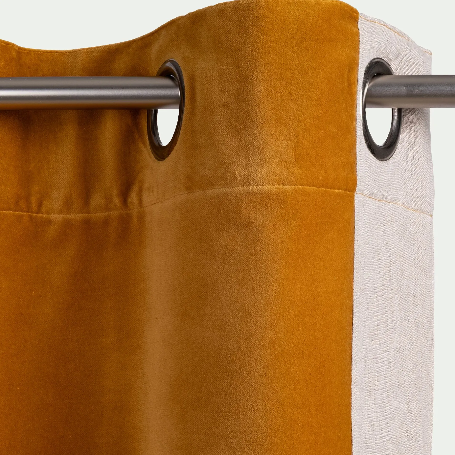 Le rideau Irene, confectionné en coton et lin, séduit par son aspect velours au toucher raffiné. Épais et légèrement brillant, il offre un tombé élégant tout en filtrant la lumière avec douceur. Uni et habillé d’un coloris jaune alep, solaire et précieux, il se présente au format 130×250 cm avec 8 œillets pour une installation facile et un rendu soigné.