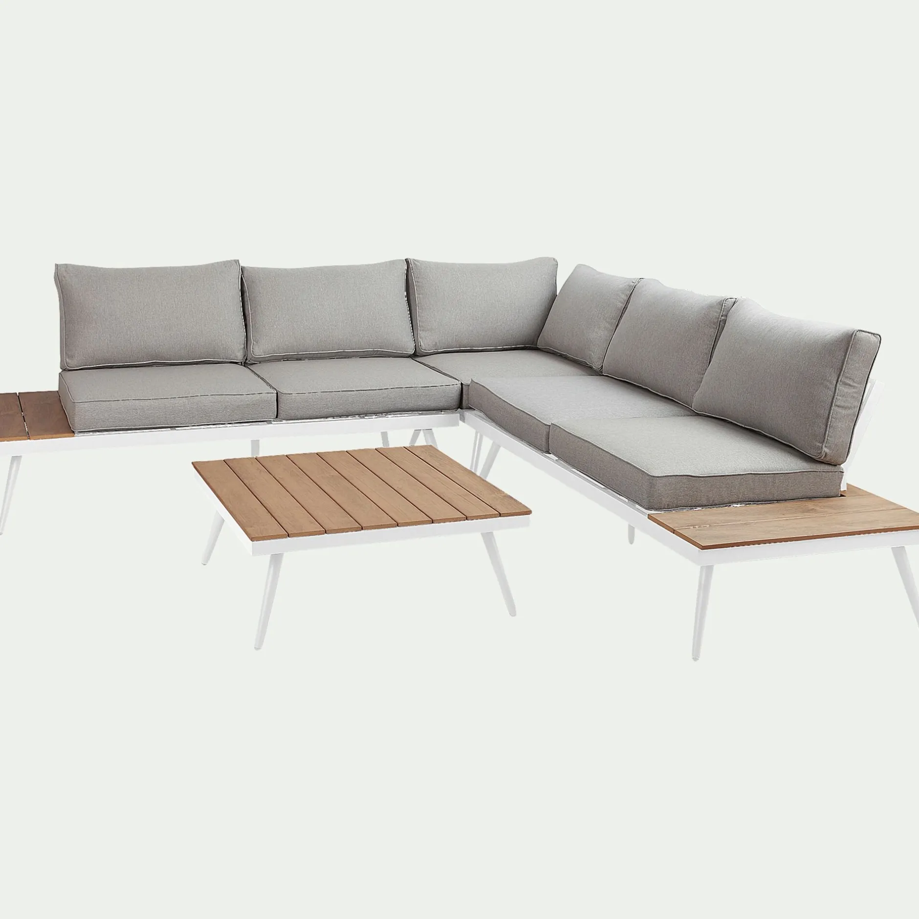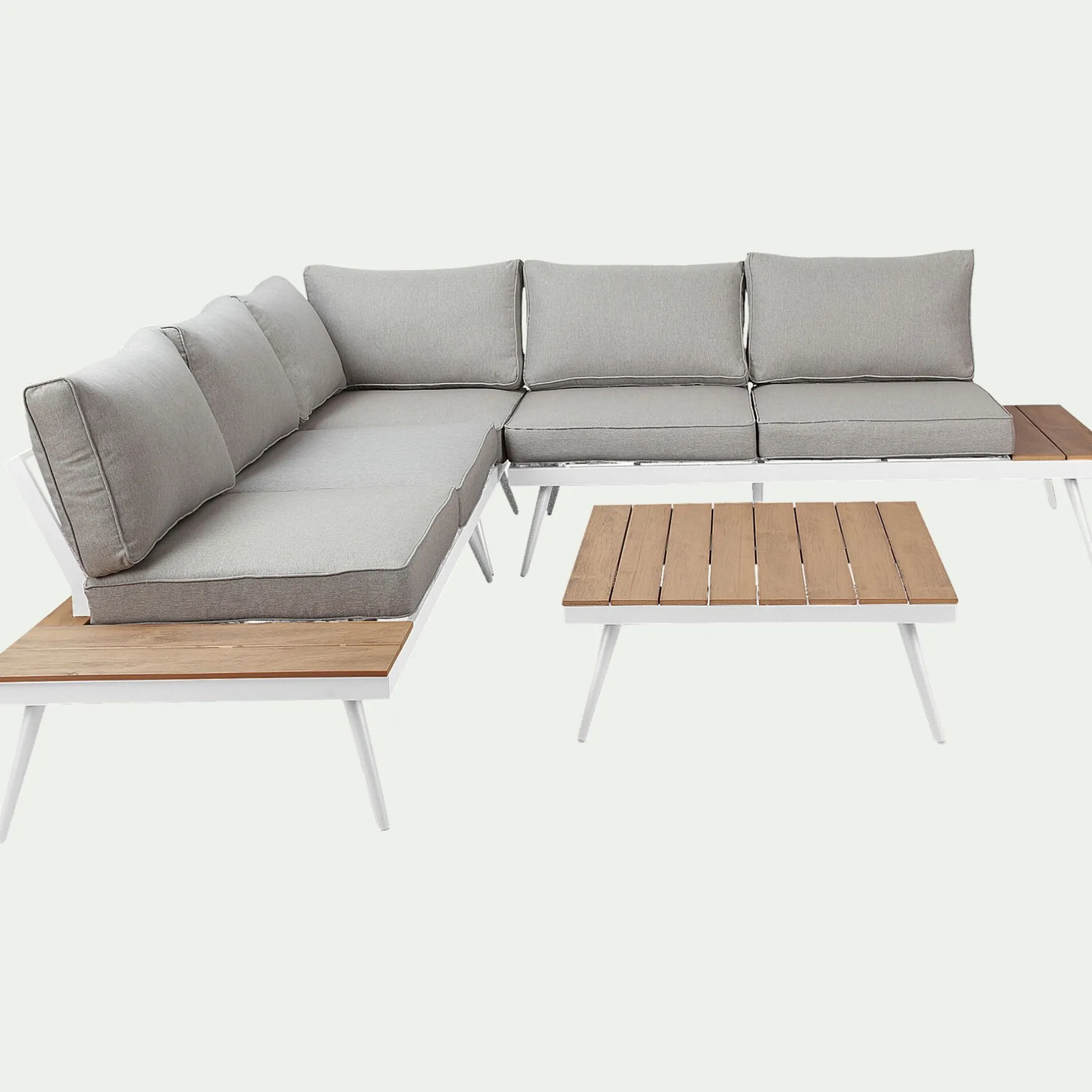 Structure en aluminium finition époxy avec latte en polywood au niveau assise et plateau de table basse.