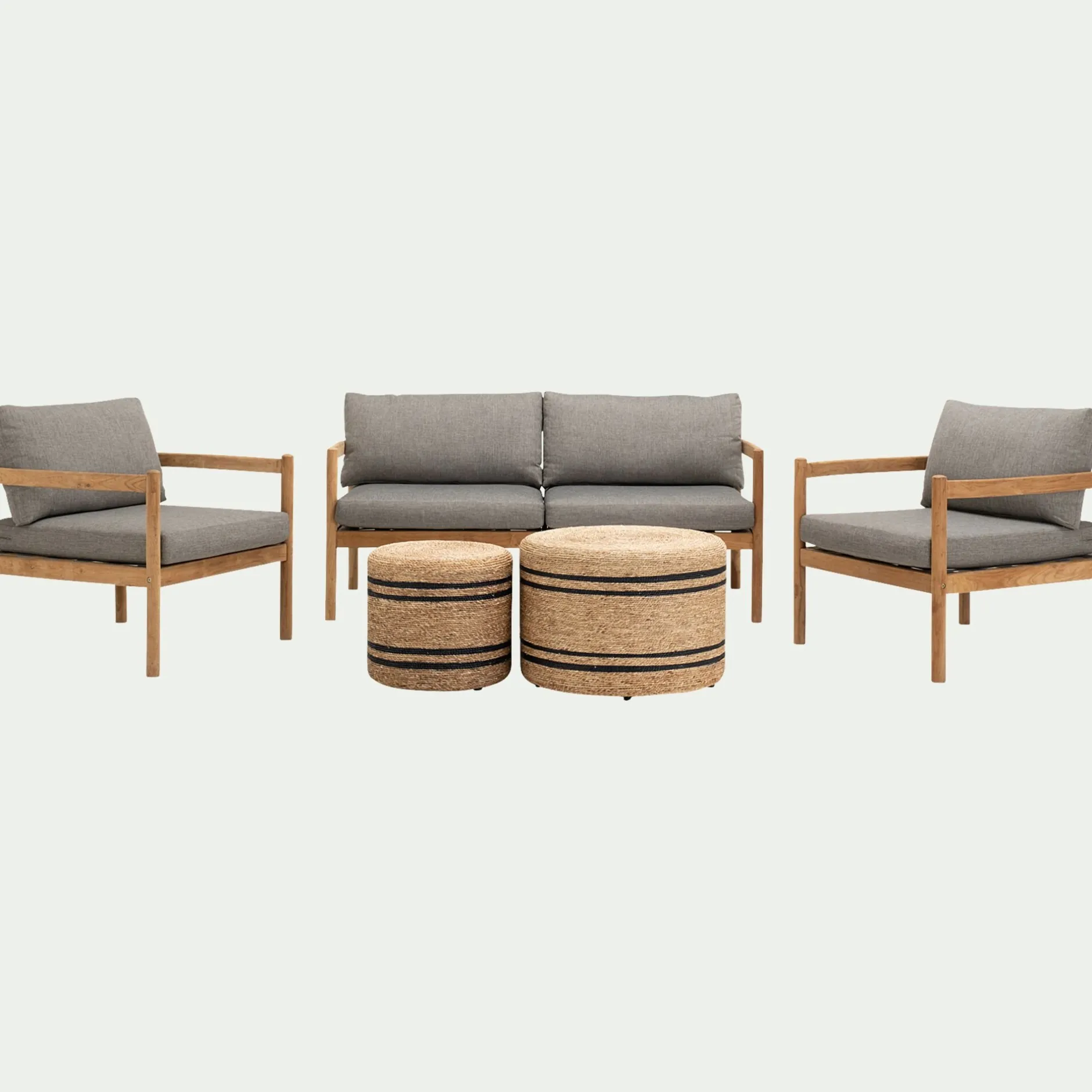Teck massif et coussin en mousse polyoléfine et tables basses en jacinthe d’eau.
