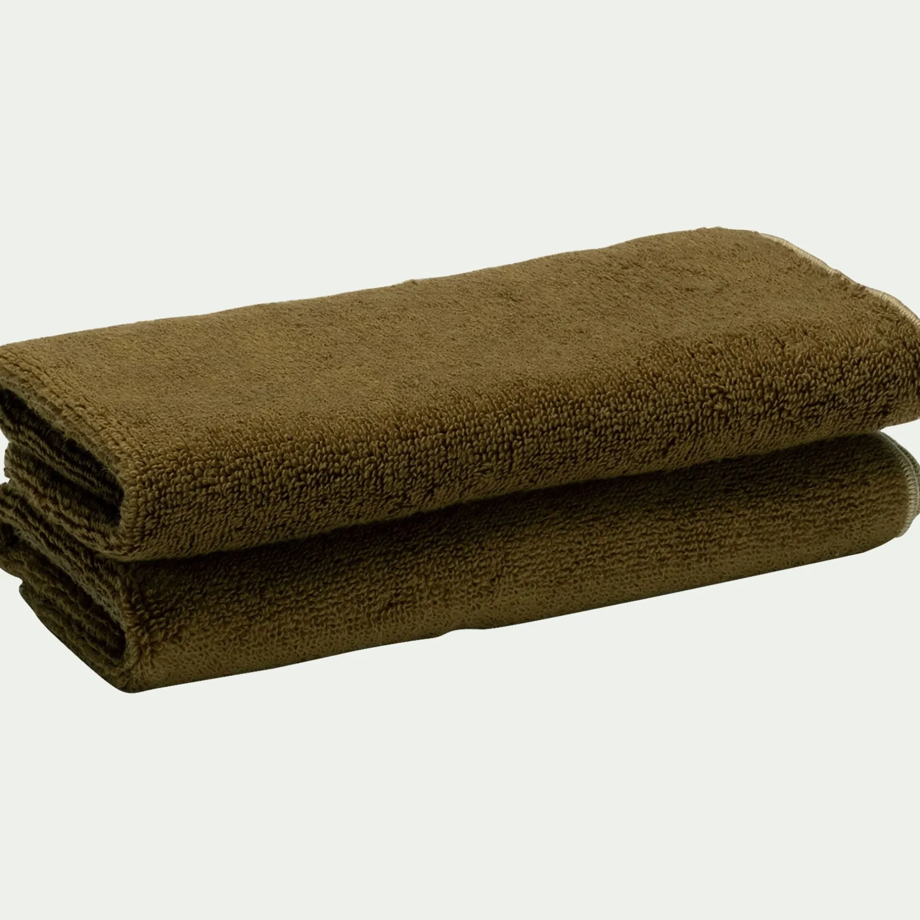 Les serviettes invité Come sont de petites serviettes de toilette. De 30×50 cm, elles s’utilisent pour se sécher les mains. Ainsi, elles trouvent leur place près du lavabo. Confectionné en coton de 400g, ce lot de 2 serviettes est certifié Oeko-Tex. Fabriqué au Portugal, il arbore notre coloris vert mousse : une nuance profonde qui participe à une atmosphère naturelle, tout en évitant les tâches visibles.