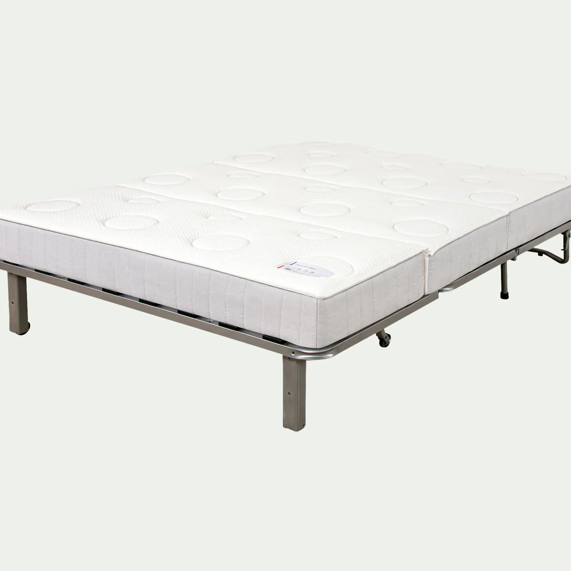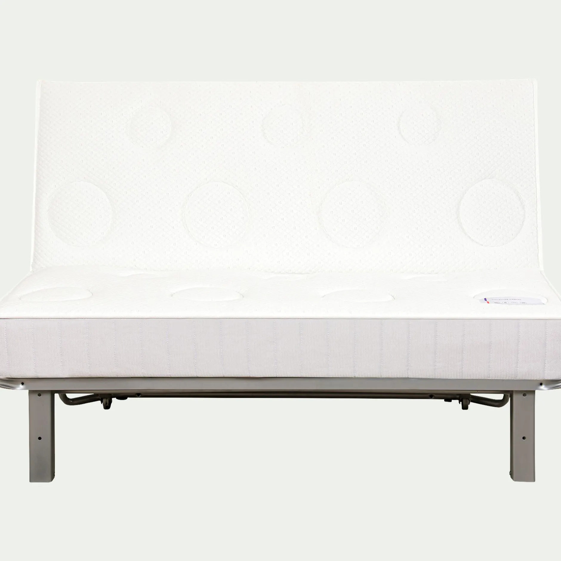 Matelas : 440 ressorts ensachés et mousse viscoélastique de densité 40 kg/m3 d’épaisseur 2 cm et feutre de 2 cm.