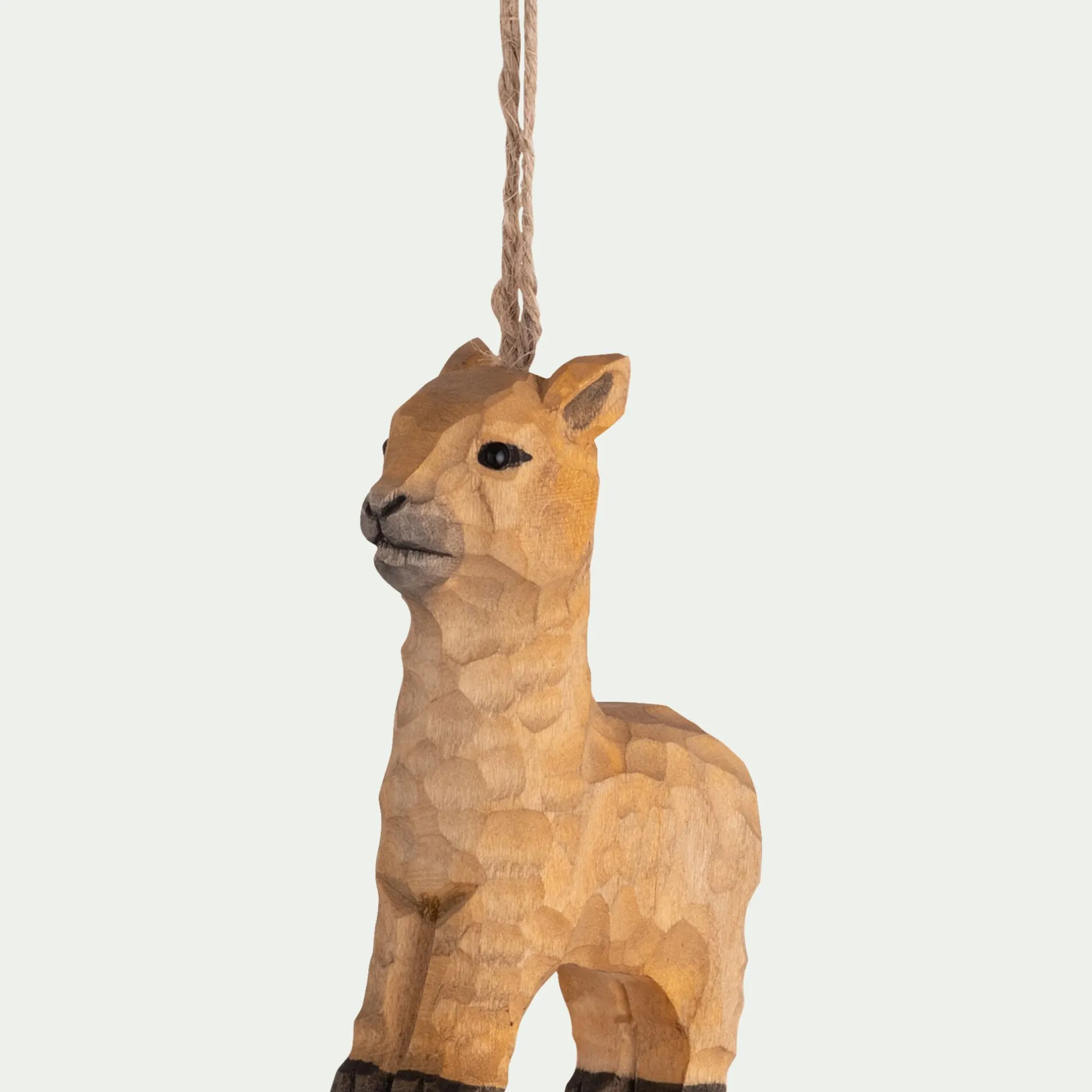 Délicatement sculptée dans le bois, cette suspension pour sapin représente un charmant lama. Elle apporte une touche de douceur et d’exotisme à votre sapin. Ses finitions détaillées et son aspect naturel en font un véritable objet de décoration, idéal pour une ambiance festive et pleine de poésie. Parfaite pour créer un sapin original et amusant, elle peut aussi être suspendue à une poignée de porte pour une touche de fantaisie dans la chambre des enfants. Un accessoire de Noël qui change de l’ordinaire.