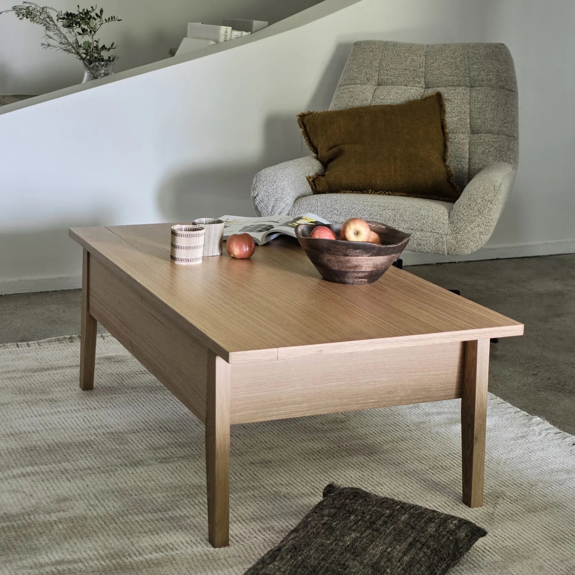 Une magnifique table basse qui allie style et fonctionnalité. Son plateau rectangulaire se redresse facilement afin de créer une table d’appoint pour vos repas. Douce et épurée, cette table basse relevable sera parfaite pour les petits espaces et les adeptes de modularité. Laissez-vous séduire par le reste de la gamme.