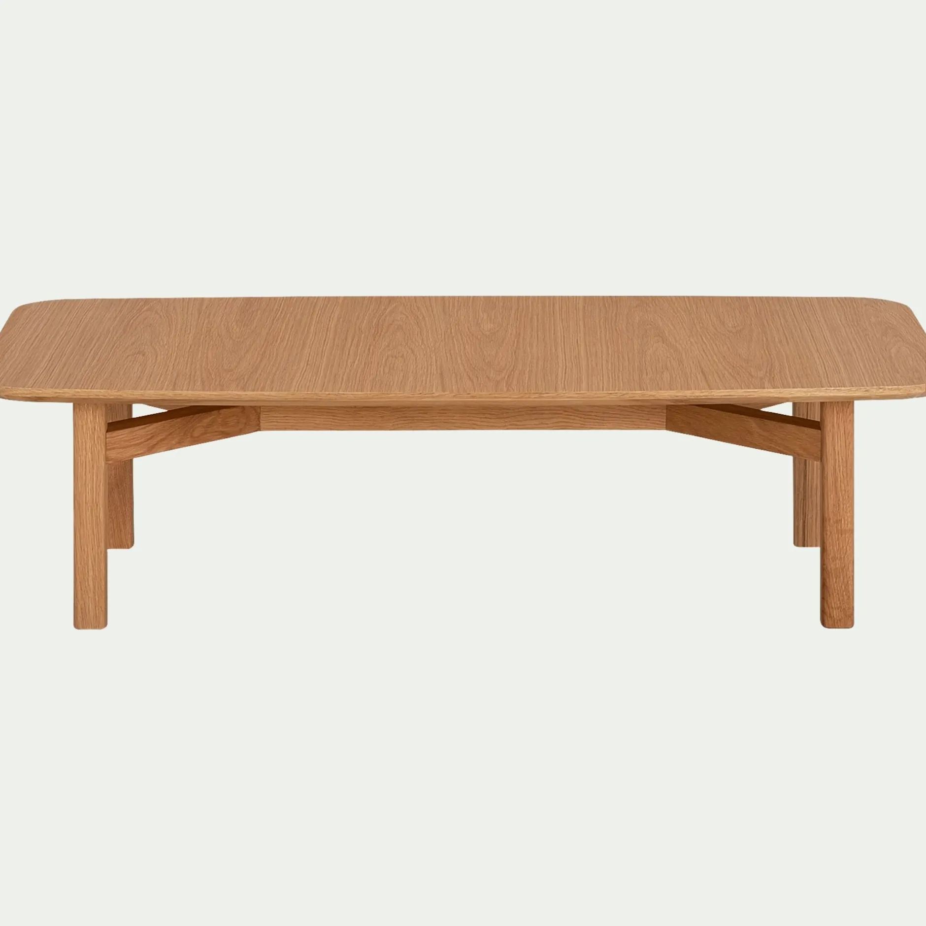 Cette table basse rectangulaire en plaqué chêne arbore un design sobre et chic. Ses pieds en bois massif légèrement en compas et ses angles arrondis apportent à ce meuble de salon style et un charme incontestable. Ce mobilier apportera du cachet à votre intérieur. Placée sur un beau tapis près de votre canapé, cette table basse marquera la déco de la pièce.