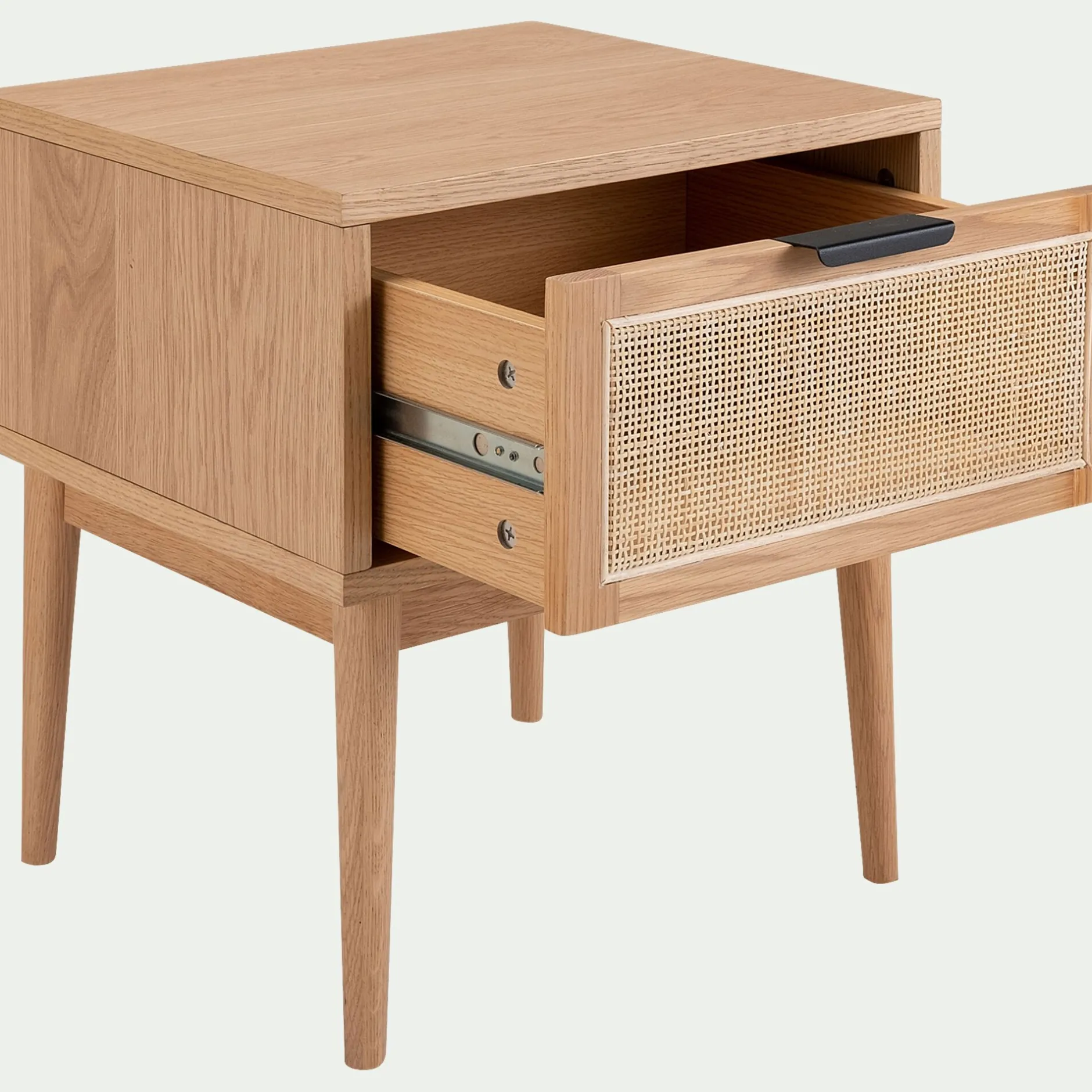 Réchauffez la décoration de la chambre avec cette table de chevet en bois et cannage. La structure en chêne massif arbore un coloris clair, orné de fines veinures. Brut et authentique, ce cadre s’accompagne d’une finition en cannage et d’une poignée noire. Simple mais design, cette table de nuit peut accueillir votre lampe de chevet, un livre, une plante, des cosmétiques… Dans son tiroir coulissant, rangez quelques affaires et profitez d’un intérieur propre et ordonné.