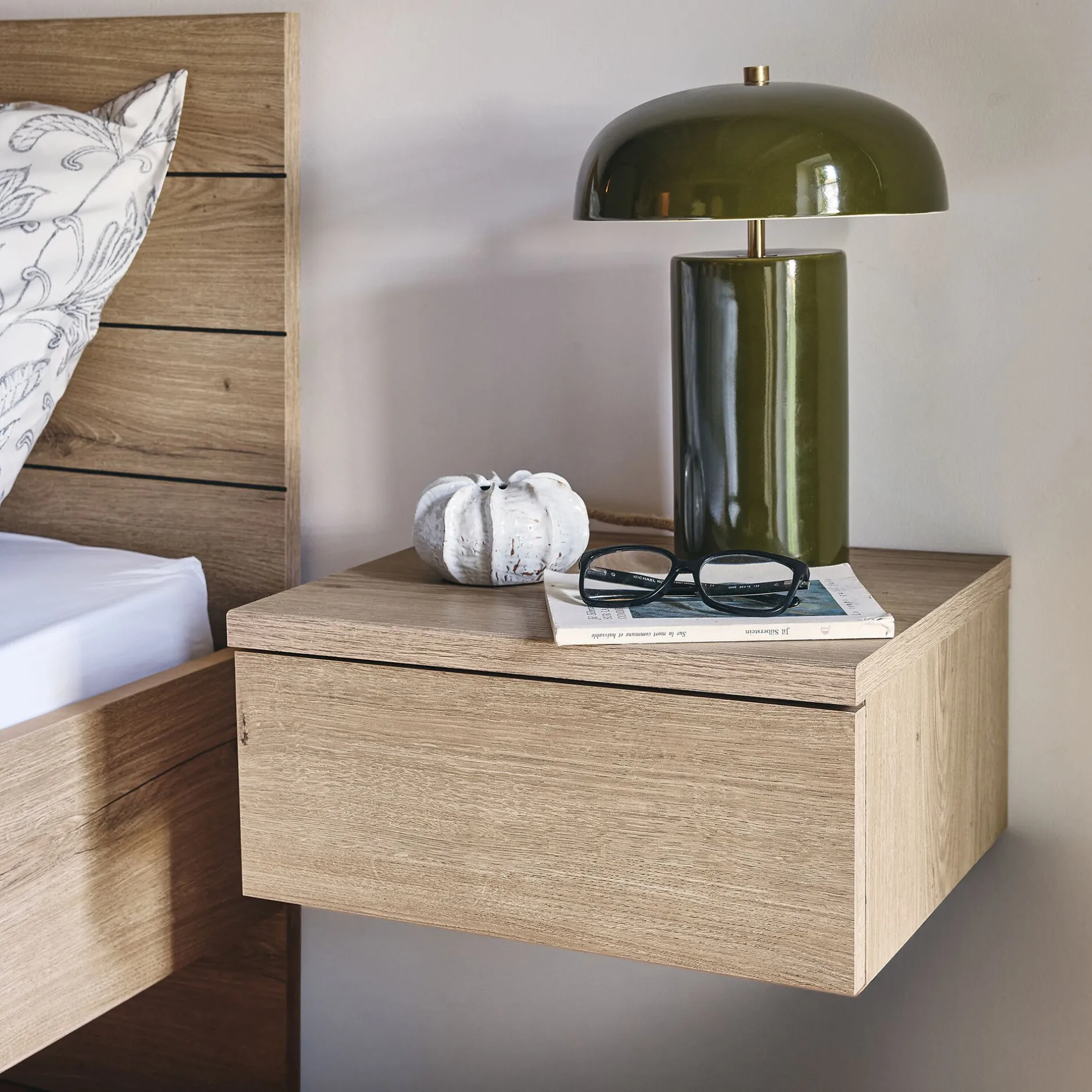 Aussi design que pratique, la table de chevet Lucian participe à un coin nuit ordonné et cocooning. Son plateau supérieur vous permet de garder près de vous votre lampe de chevet ou encore votre lecture du soir. Cette table de chevet suspendue se compose également d’un tiroir de rangement. Coulissant, il s’ouvre à l’aide d’une poignée en métal noir, détail moderne qui apporte du caractère à l’ensemble. Ce petit meuble participe à l’organisation mais surtout à une décoration chaleureuse.