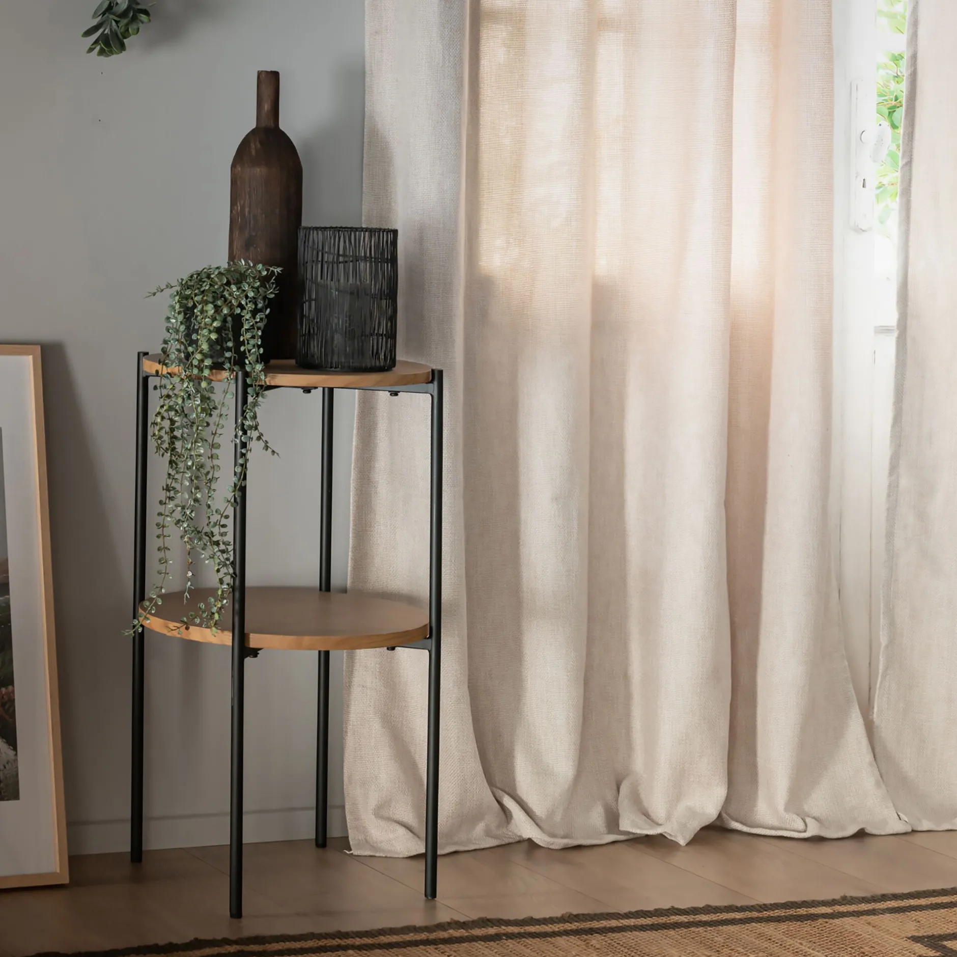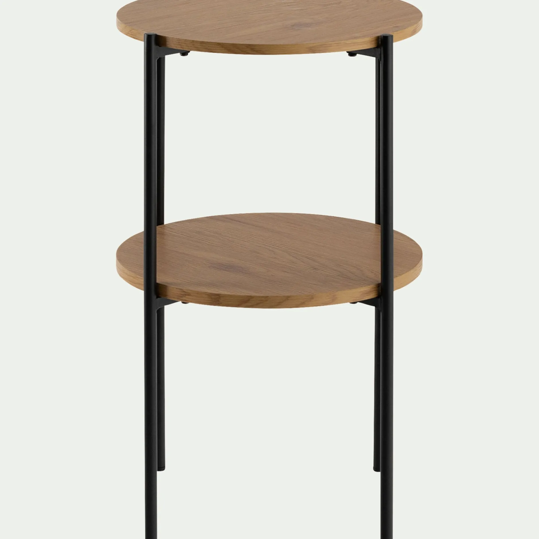 Ce bout de canapé fixe présente deux niveaux de plateau. Ainsi, vous pouvez y ranger aussi bien vos télécommandes et magazines que de la décoration, comme un vase, une plante ou une bougie. Espace de rangement, présentoir, table de chevet… Ce bout de canapé en bois prend la fonction que vous lui donnez. L’imitation chêne s’associe au métal pour un look industriel, très tendance. Ce bout de canapé rond est un excellent basique autour duquel façonner votre style.