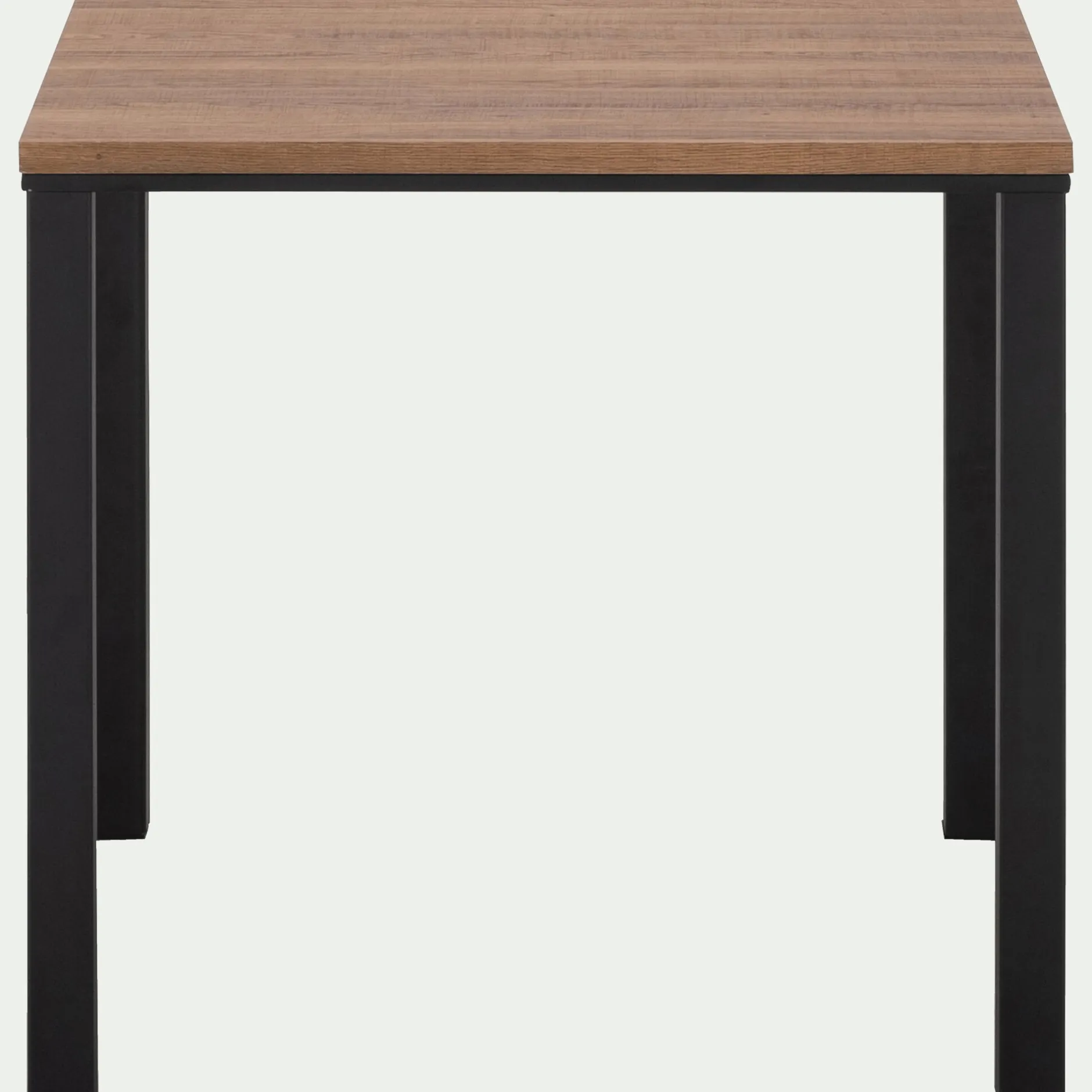 Plateau en panneau de fibres de moyenne densité imitation chêne d’une épaisseur de 2,5cm, avec revêtement papier 3D effet chêne. Struture et piètement en acier epoxy peint noir mat.
