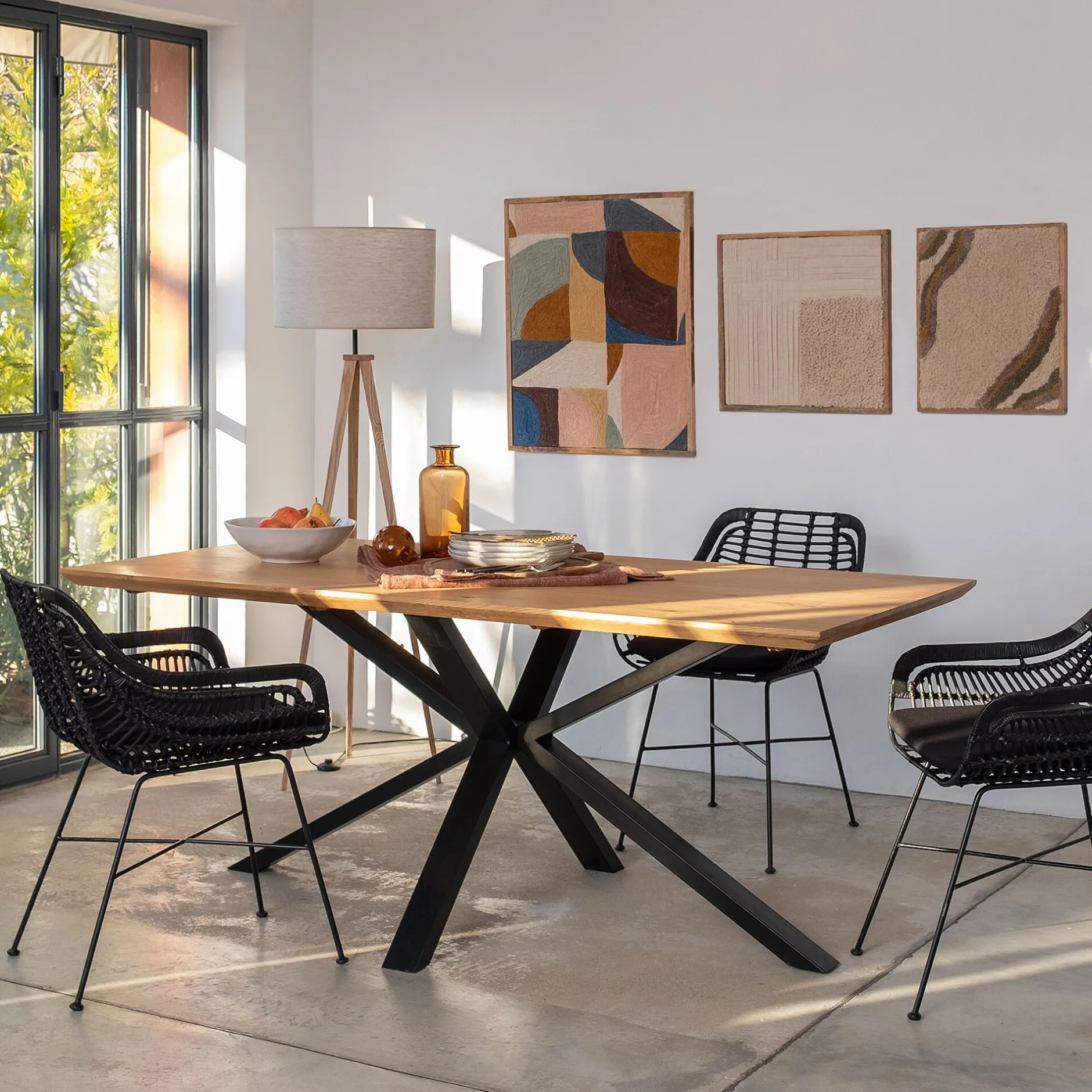 Monieux est une belle table design confectionnée en Europe à partir de matériaux nobles. Cette table de repas présente un grand plateau de 90×180 cm. Cette planche en bois massif conserve un aspect brut qui participe à un style rustique. Cette table de repas en chêne est un véritable atout pour apporter une touche d’authenticité à la salle à manger. Son piètement graphique consiste en quatre pieds entrecroisés, des lignes franches dans un coloris noir qui appuient le caractère de cette table. Une très belle pièce à adopter comme objet déco à part entière.