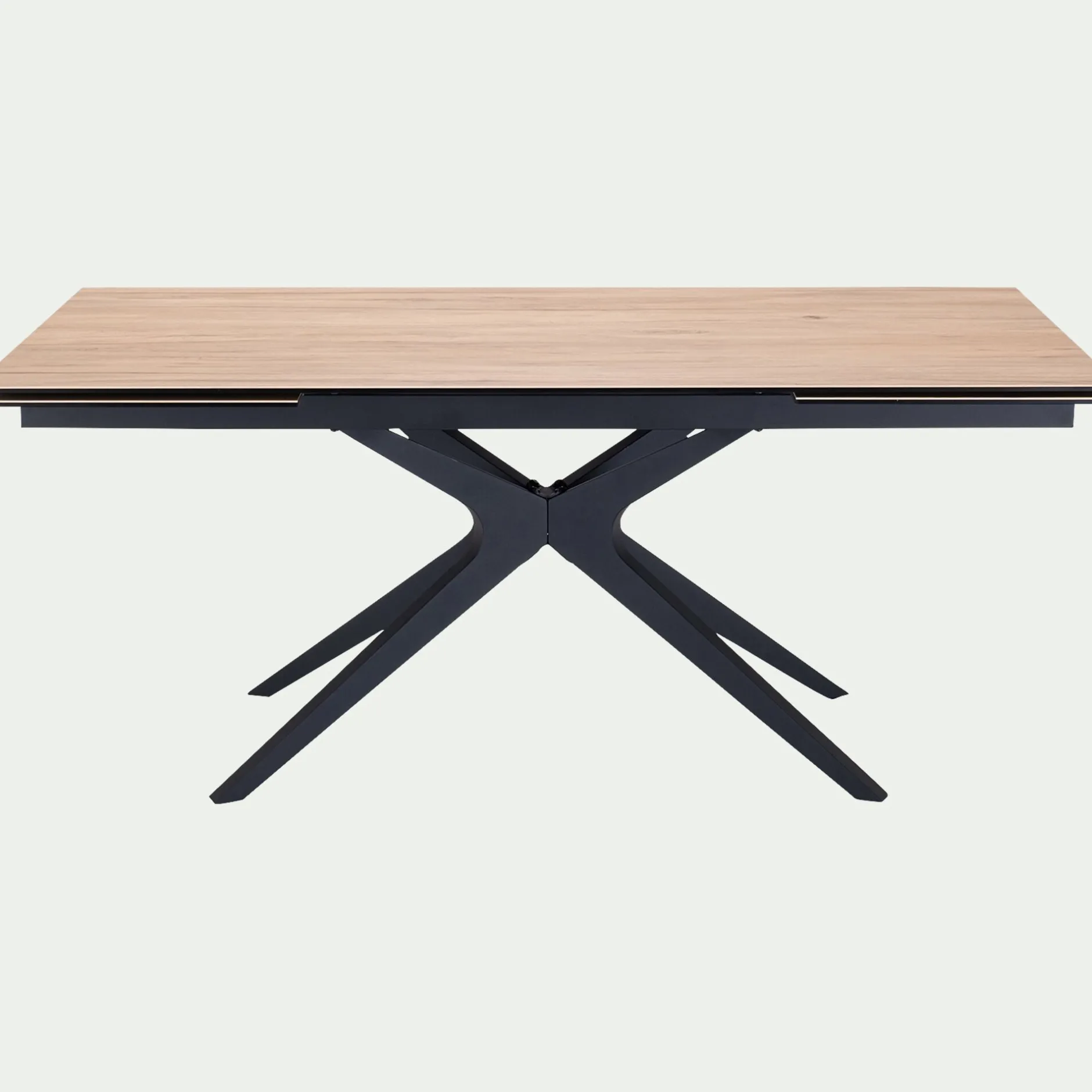 La table de repas Sara associe style contemporain et fonctionnalité. Sa forme rectangulaire s’adapte à toutes les configurations grâce à un système de rallonge pratique, offrant plus d’espace en un instant (jusqu’à 12 personnes). Son plateau en céramique effet bois séduit par son aspect chaleureux tout en assurant une excellente résistance au quotidien. Le piètement graphique en métal noir apporte une touche moderne et affirmée, pour une table extensible aussi esthétique que conviviale.