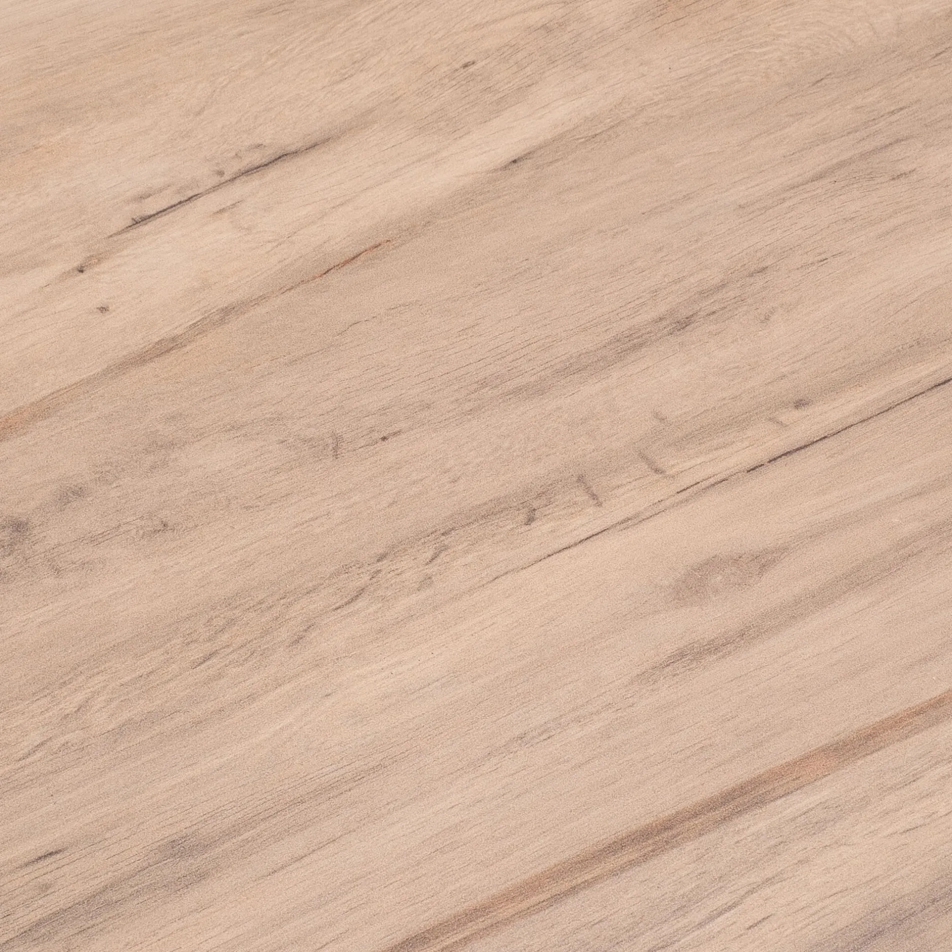 Piétement en métal. Plateau en céramique et verre effet bois.