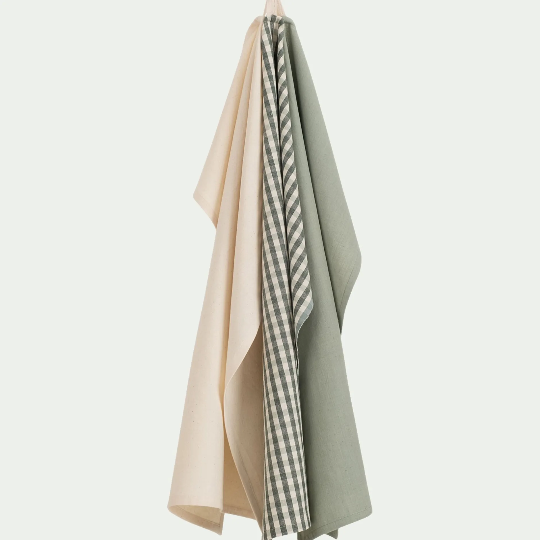 Avec ce lot de 3 torchons, la cuisine se pare de teintes douces et intemporelles. L’un beige, l’autre bleu calaluna et un dernier à carreaux vert olivier et beige, ils apportent une touche élégante à l’espace. Confectionnés en coton certifié Oeko-Tex, ces torchons de cuisine sont aussi absorbants que résistants, parfaits pour un usage quotidien. Leur format de 50×70 cm assure une prise en main facile, tandis qu’une languette permet de les suspendre. Avec, la cuisine est chaleureuse et bien équipée.