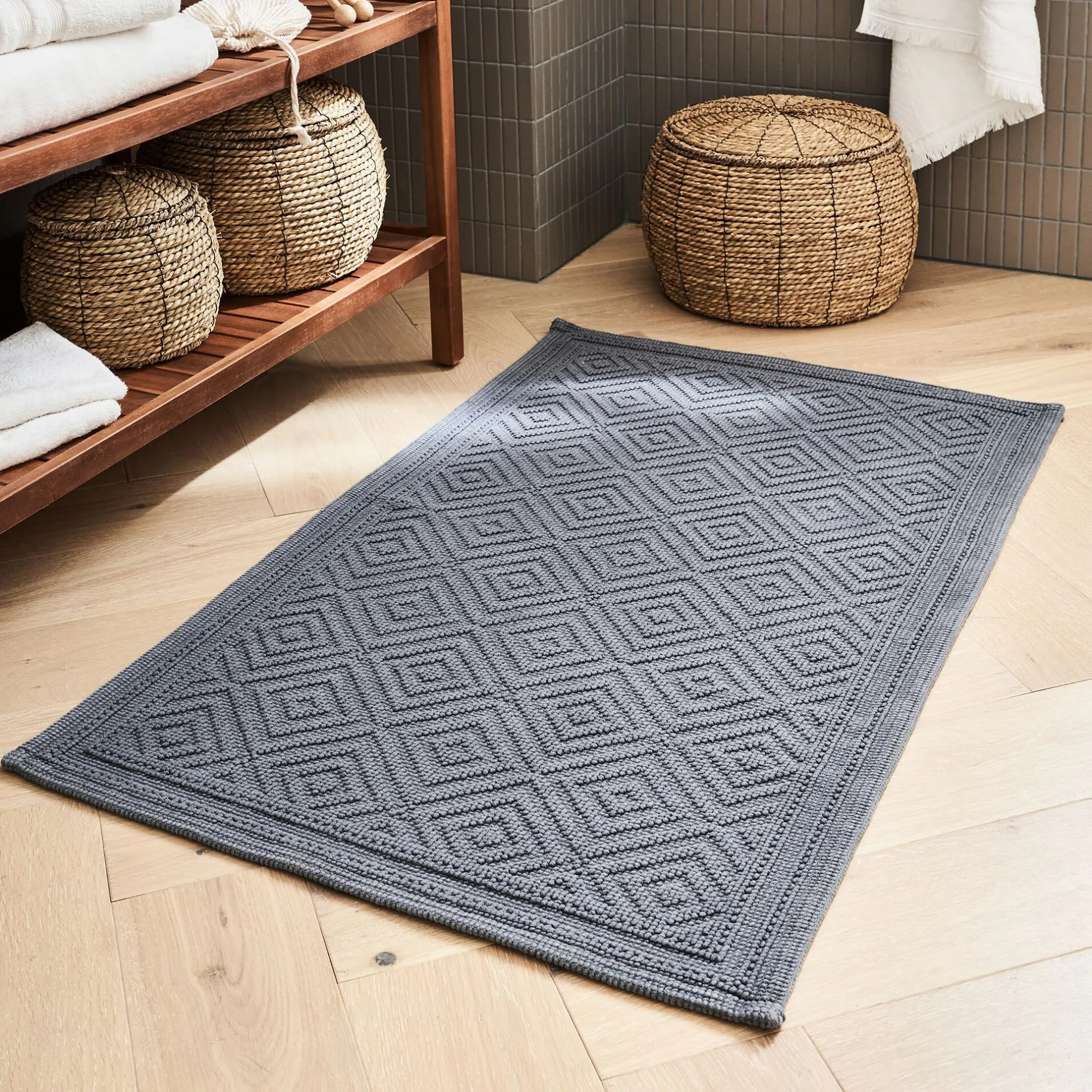 Les pieds sur Terre mais la tête encore ailleur, le matin ne devrait être que douceur. Le tapis de salle de bain gris restanque Sadou offre toute la tendresse nécessaire pour commencer la journée du bon pied. Son tissu épais et fourni procure une sensation agréable, de quoi ne pas se laisser perturber et se réveiller tout en douceur dans la salle de bain. 100% coton, c’est un tapis de très belle qualitéqui fait partie des incontournables. Il a été crée pour durer et supporter tous les passages quotidiens. Disponible en plusieurs coloris, il joue un rôle pratique et décoratif. Sa finition, un piquage en forme de losanges, est très travaillée pour un rendu abouti et qualitatif.