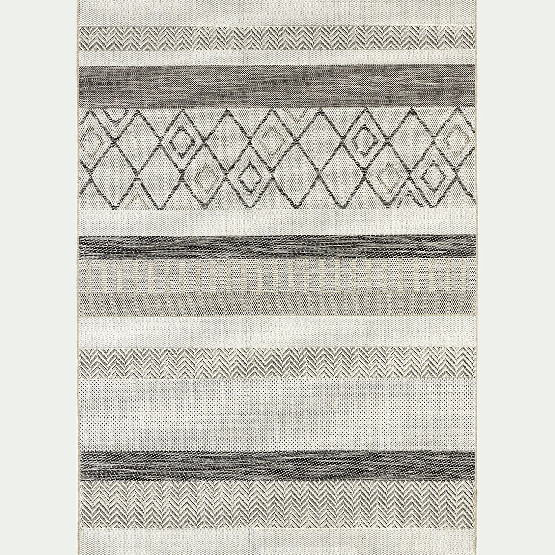 Ce joli petit tapis en 120x170cm composé de bandes alternant chevrons et motifs ethniques donnera du cachet à votre intérieur ou votre extérieur. Ce tapis, décliné dans un camaïeu de gris et de marron chiné, est bel élément déco, qui embellira votre terrasse, l’entrée de la maison, ou même la chambre comme descente de lit. Il convient aussi très bien en tapis de couloir.