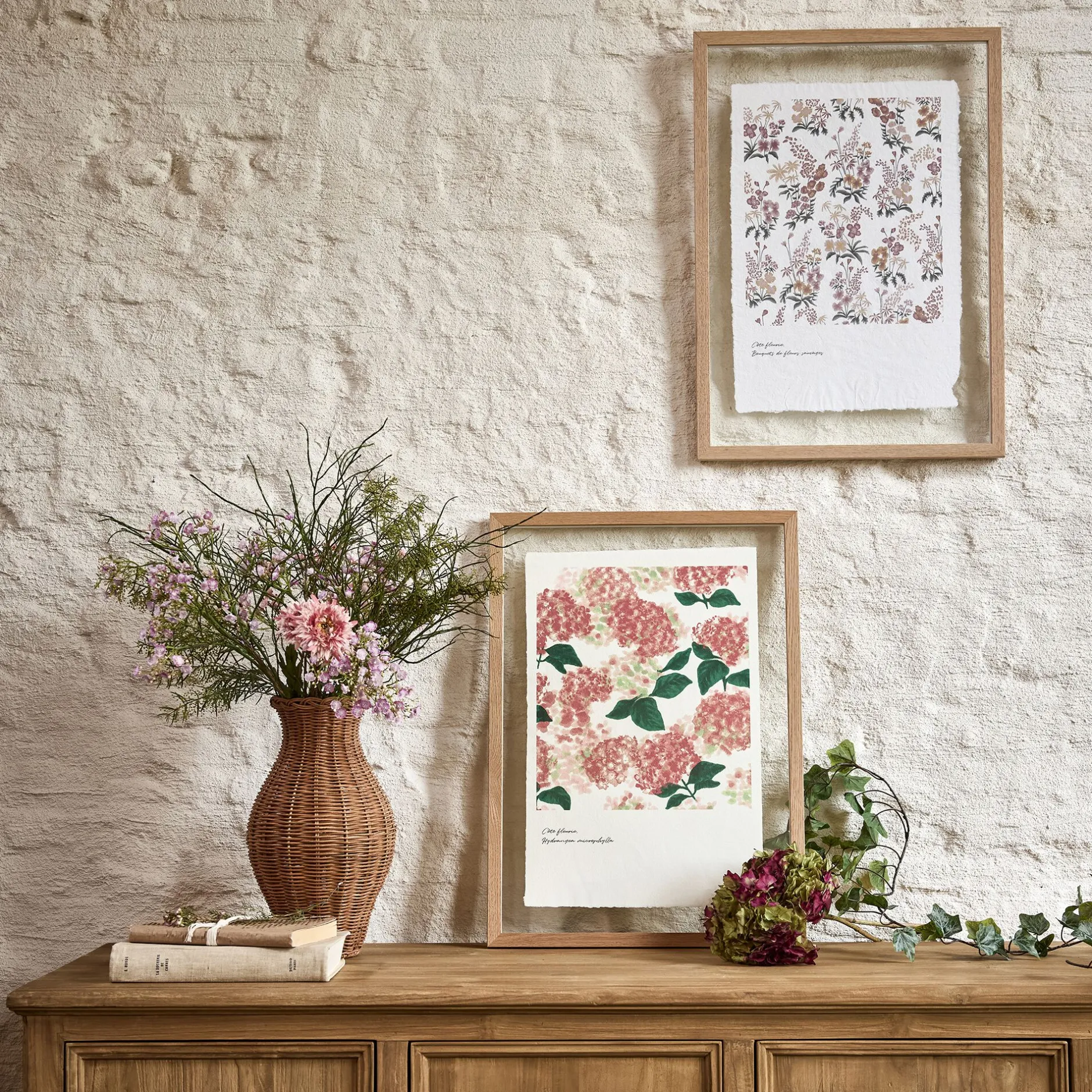 Cette décoration murale met à l’honneur la beauté délicate des hortensias roses. Imprimée sur un papier chiffon en coton recyclé, l’image dévoile une texture subtile qui accentue son charme authentique. Deux vitres en verre viennent protéger cette œuvre. Encadrée dans un contour en chêne massif, elle marie l’élégance naturelle du bois aux teintes tendres et romantiques des fleurs. Une image encadrée apaisante qui trouve sa place dans une décoration douce et raffinée.