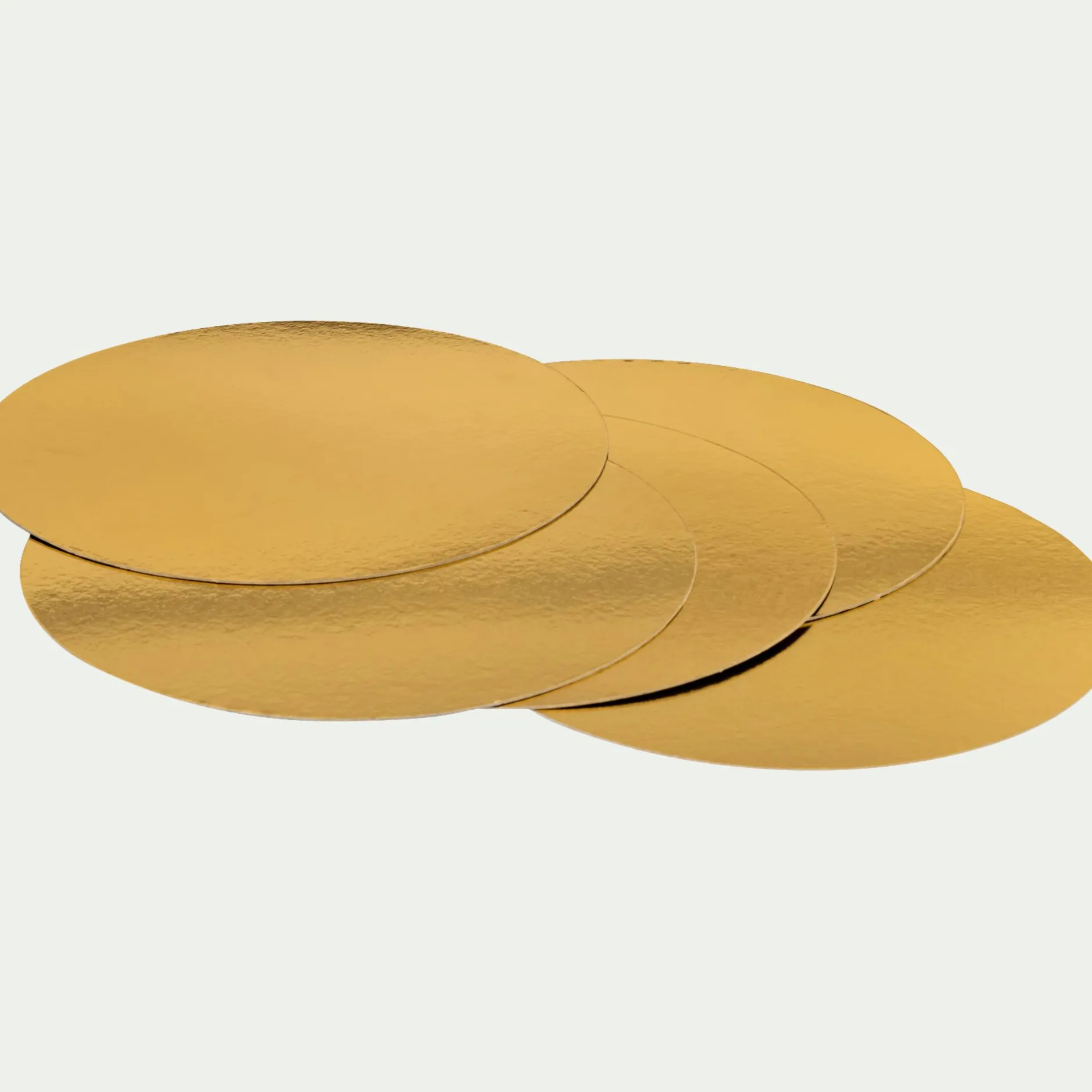 Pour servir et présenter vos gâteaux ronds, rien de tel que les supports Patisdecor. De 30 cm de diamètre, ils permettent de soutenir de grands gâteaux, tout en les sécurisant et en leur apportant une touche festive. Dans un coloris doré, ils apportent une note chaleureuse et participent à une table lumineuse. Vendus par lot de 5, ces supports à gâteau ronds peuvent se réutiliser une fois nettoyés à l’aide d’un chiffon humide.