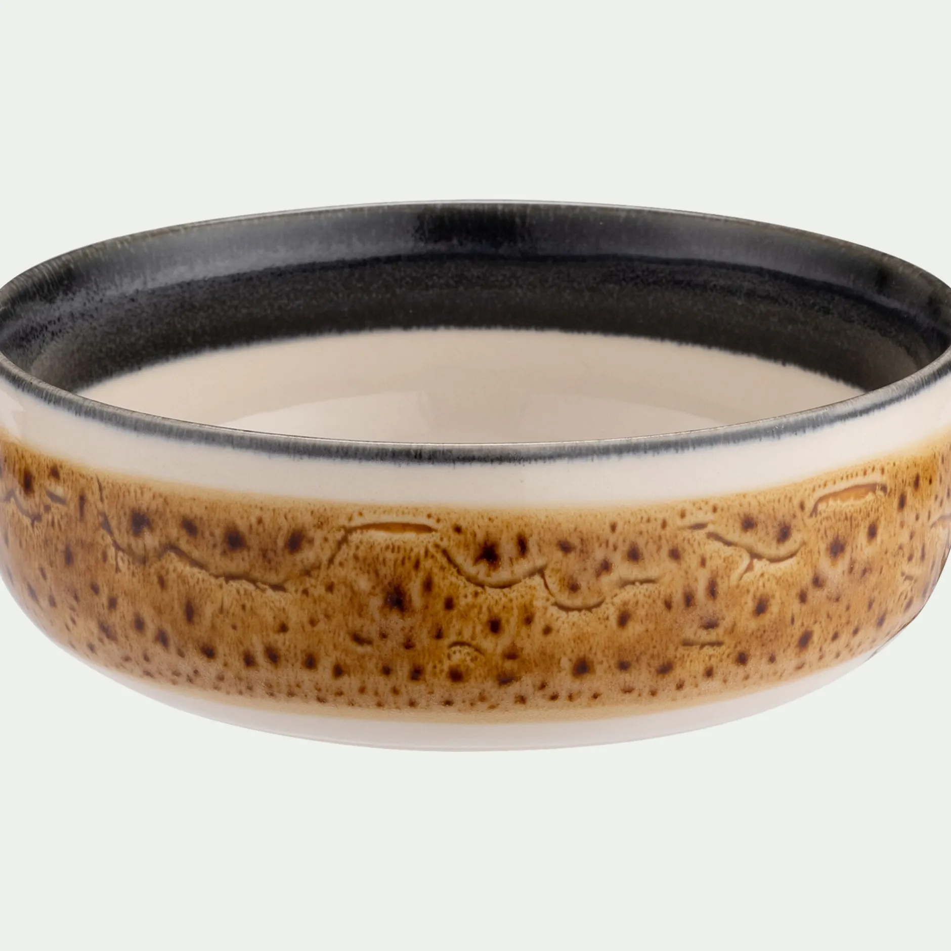 Apportez une touche chaleureuse à votre table avec ce bol en grès de 15 cm. Fabriqué au Portugal et peint à la main, il séduit par ses nuances brunes mouchetées et son émaillage contrasté, qui soulignent son authenticité. Son design brut et sa forme généreuse en font un compagnon idéal pour vos soupes, céréales ou petits plats à partager. Résistant et esthétique, ce bol reflète un savoir-faire céramique unique, parfait pour sublimer vos repas au quotidien.