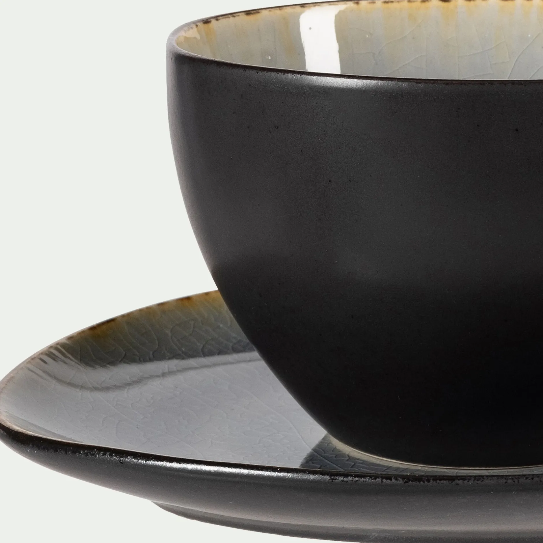 Café, tisane, chocolat chaud… Servez vos boissons chaudes dans la tasse Selime, une création en grès qui apporte une touche contemporaine à l’art de la table. Cette tasse en céramique arbore un design traditionnel, avec des courbes et une anse arrondis. Sa sous-tasse vient rompre avec ce côté classique en présentant une forme organique, très tendance. Cet ensemble de tasse et de sous-tasse en grès affiche un beau coloris gris profond, sublimé par un émail réactif brillant rendant chaque pièce unique dans ses détails.