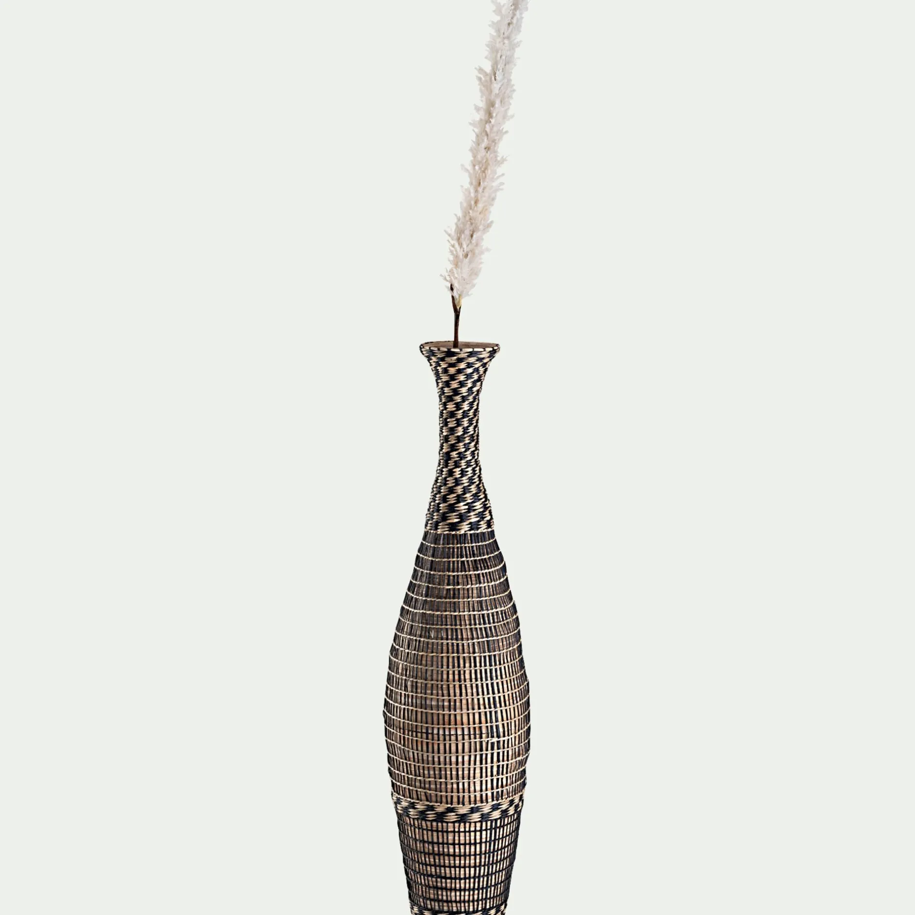 Avec sa belle hauteur de 84 cm, le vase bicolore Aganta se dépose au sol. Près du canapé, du meuble télé ou d’une plante d’intérieur, ce grand vase naturel apporte du cachet à votre intérieur. Inspiré de jarres propres à la culture méditerranéenne, cet objet déco présente de beaux volumes. Elancé, ce long vase est constitué d’une structure en bambou recouverte d’un tressage en jonc de mer. Ce vase déco est donc entièrement fabriqué à partir de végétaux, une particularité faisant son charme. Alors que certaines fibres naturelles sont laissées brutes, d’autres sont teintes en noir pour donner du contraste à ce vase. Un motif graphique et ethnique qui se suffit à lui-même. Jouez le total look en ornant ce grand vase en jonc de mer de quelques fleurs séchées.