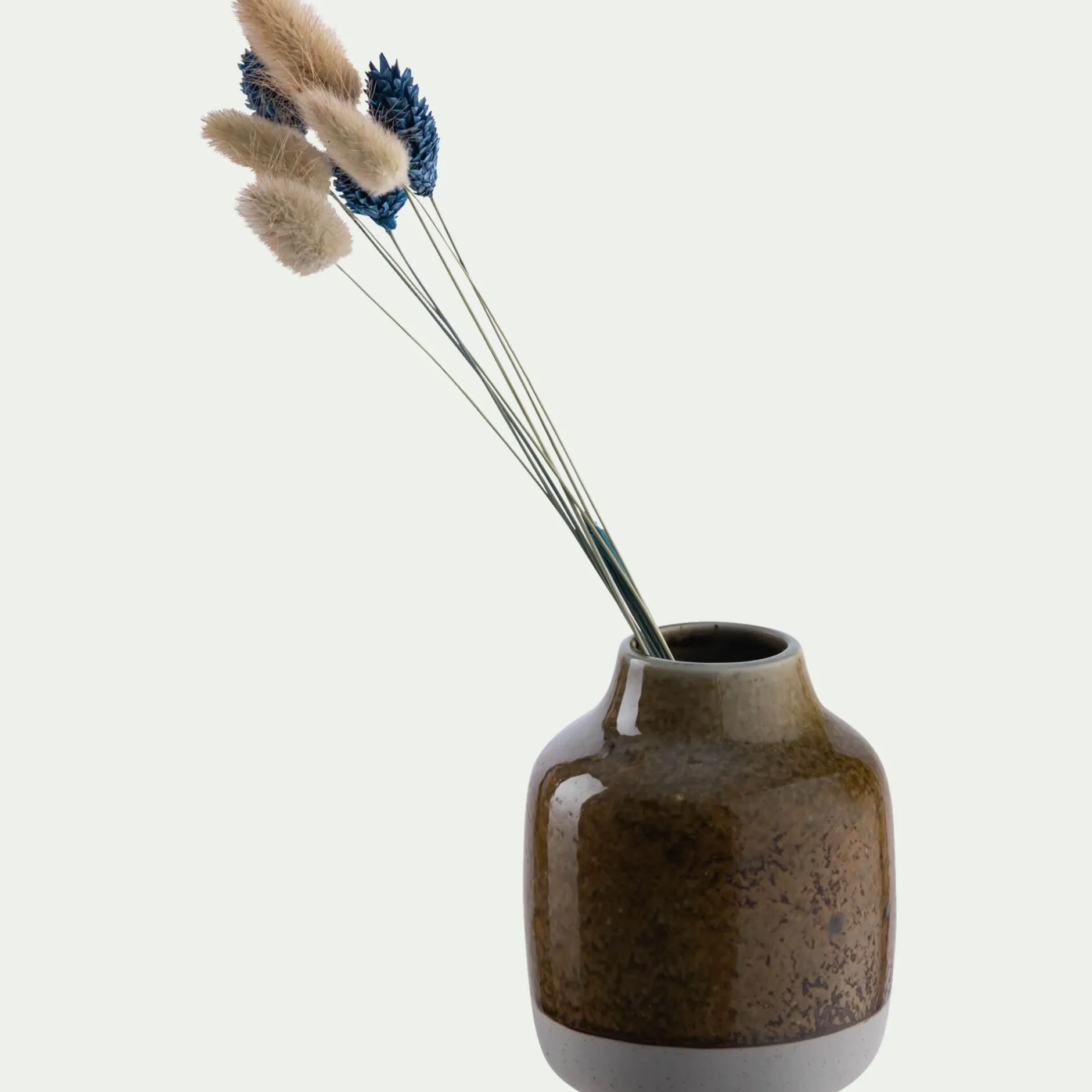 Petit objet plein de charme, ce vase décoratif joue les contrastes entre authenticité et raffinement. Confectionné en porcelaine, il présente une base brute couleur naturelle, surmontée d’un émail réactif marron aux reflets irréguliers. Chaque pièce devient ainsi unique, révélant des nuances subtiles qui réchauffent l’espace. À poser seul ou en accumulation, ce vase apporte une touche chaleureuse à la décoration.