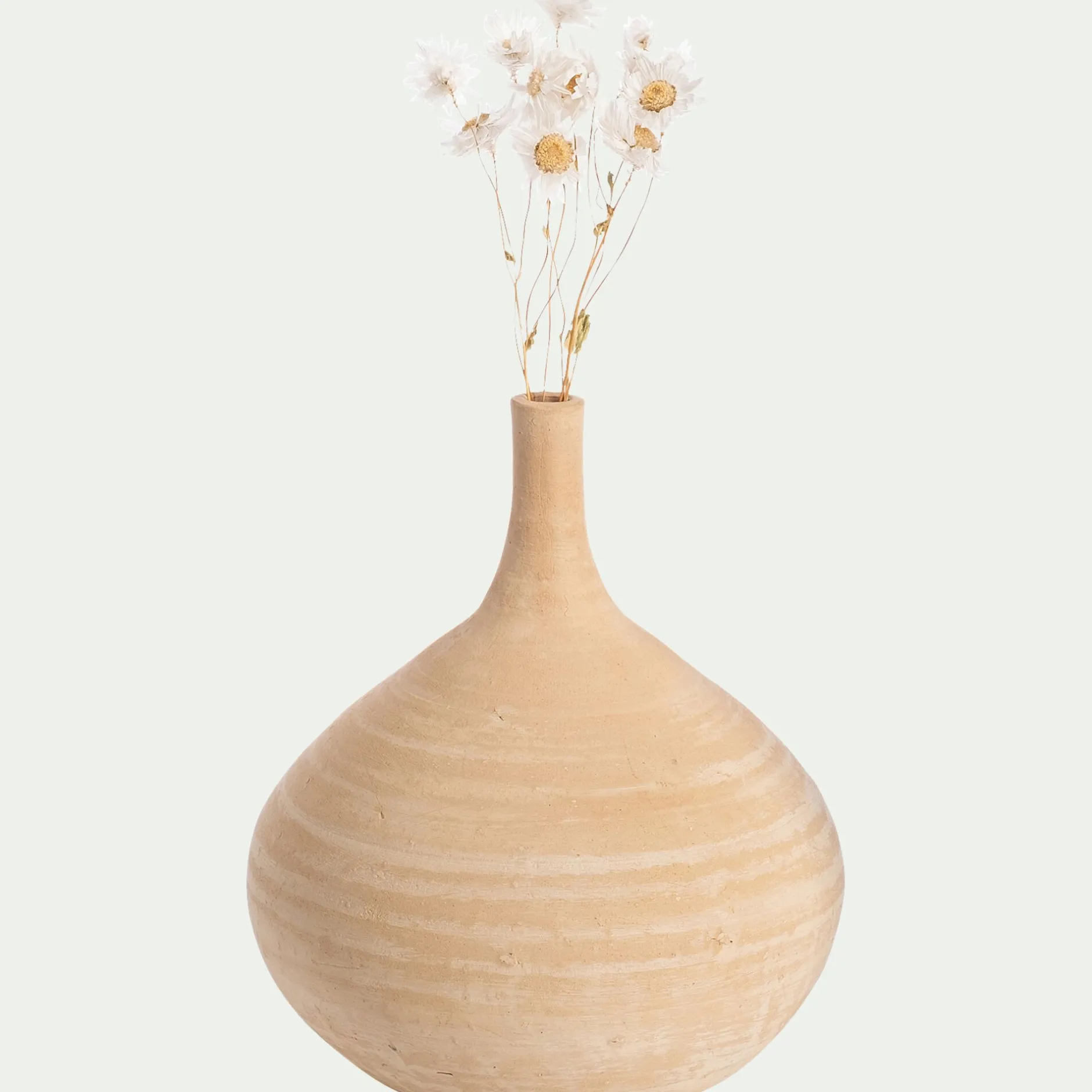 Fabriqué en terre cuite, le vase Laou apporte une touche d’authenticité à votre décoration. La matière brute est travaillée pour former ce vase rond au col haut. La terre naturelle affiche plusieurs strates qui ensemble forment un camaïeu de beige. Ce vase en terre cuite apporte du charme à la déco et du caractère à l’ambiance. Il vous transporte aux confins du désert marocain, terre chaleureuse et lumineuse dont la personnalité se reflète dans ce vase.
