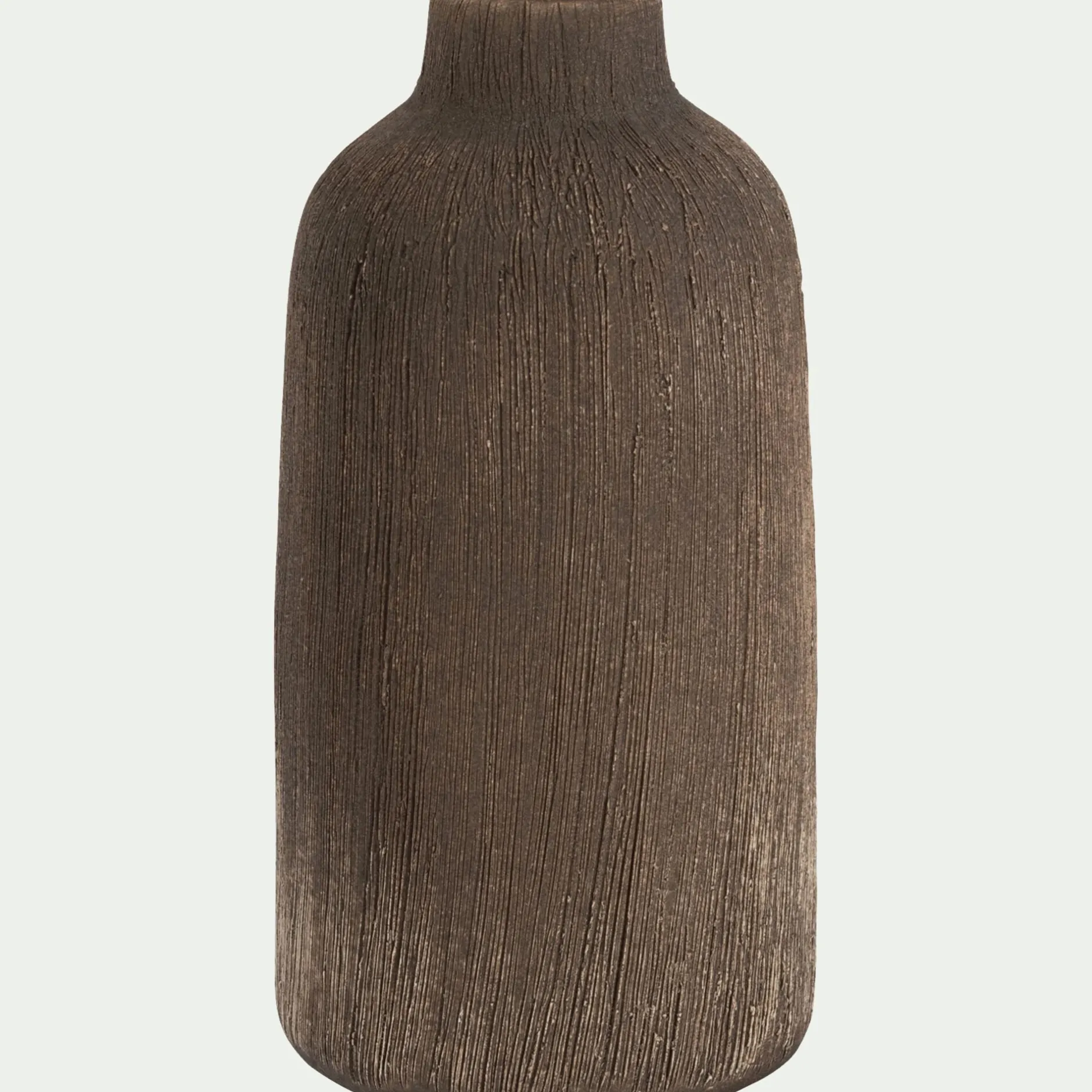 Ce vase en faïence mesure 9 cm de diamètre pour 17,5 cm de hauteur. Avec ces proportions, il arbore une forme dite bouteille avec un goulot plus étroit. Ce vase en céramique met en valeur notre coloris brun terre d’ombre issu de notre palette méditerranéenne. Cette nuance sombre et profonde fait écho à la terre riche et féconde des plateaux de Valensol dont ce vase bouteille tient le nom. Ce vase marron est strié : un détail qui vient rythmer votre décoration en lui apportant de la texture.