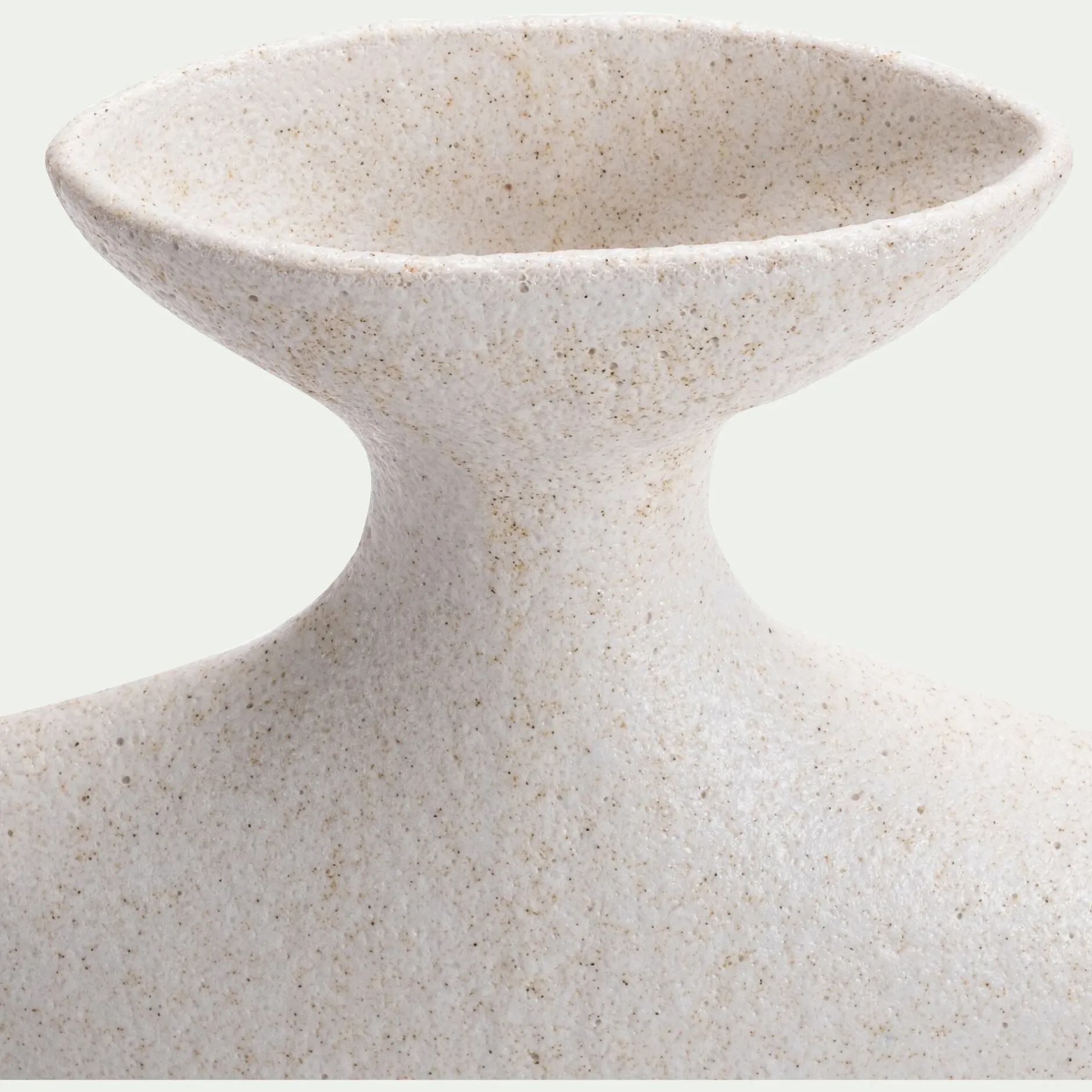 Ce vase décoratif séduit par sa silhouette contemporaine, née d’un subtil équilibre entre lignes géométriques et formes organiques. Confectionné en céramique, il présente une finition texturée qui capte la lumière. Son coloris beige délicatement moucheté apporte une touche naturelle et apaisante, idéale pour sublimer une décoration épurée ou bohème. Sa forme unique en fait un support parfait pour accueillir de grandes tiges, qu’elles soient florales ou séchées. Objet d’art, ce vase en céramique ajoute une note raffinée et sculpturale à n’importe quel espace.