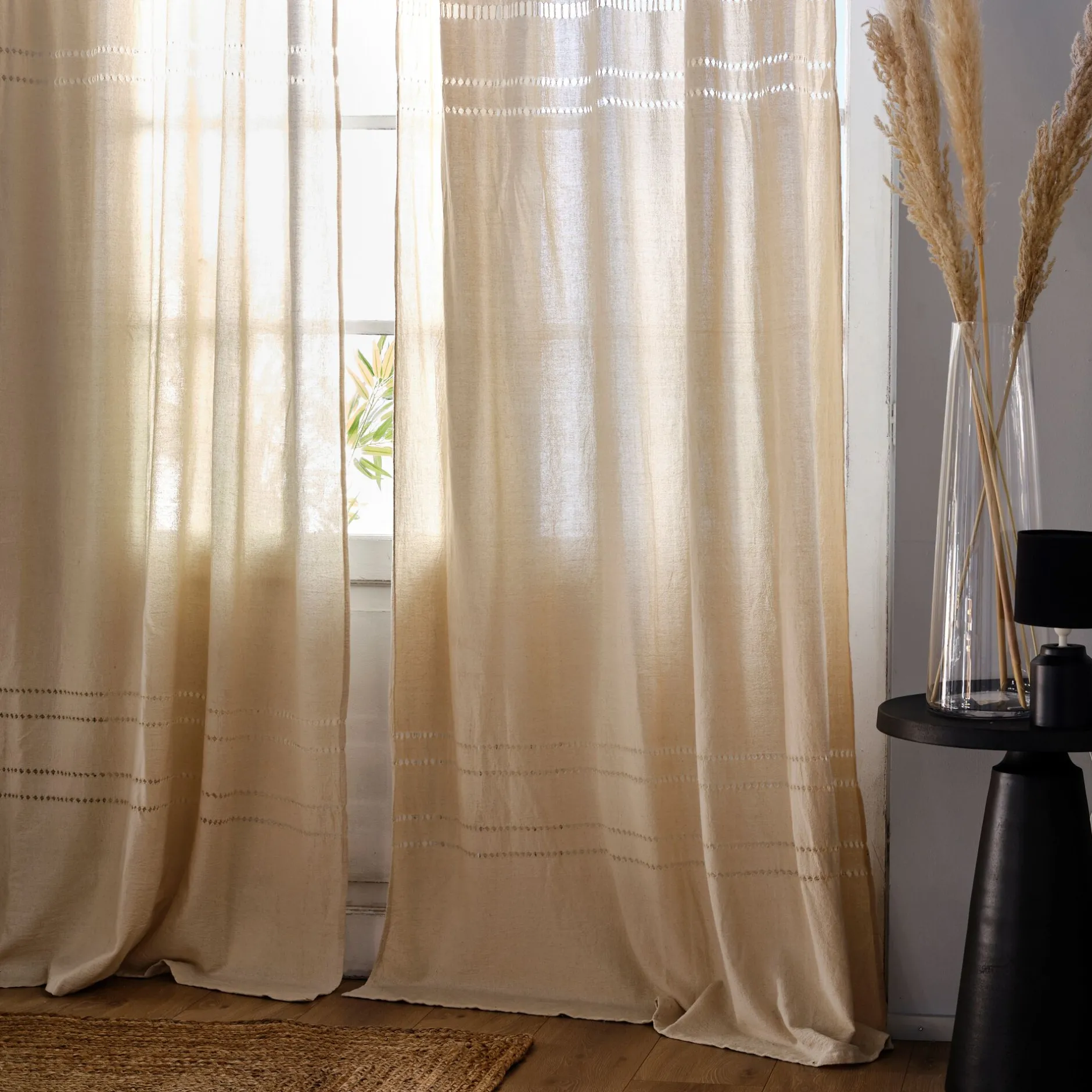 Profitez de votre intimité tout en créant une atmosphère douce et chaleureuse grâce au voilage en coton Mukharama. Délicatement tissé en pur coton, ce voile vaporeux offre une transparence laineuse, entre modernité et rusticité. La grâce de ce voilage à nouettes se retrouve également dans son point ajouré, une finition aérienne qui filtre la lumière et laisse flotter cette sensation d’apesanteur. De 140×250 cm, ce voilage ajouré se suspend à la tringle grâce à ses 8 nouettes ton sur ton. Un voilage beige qui sublime votre cocon en encadrant vos fenêtres.